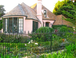 Carmel-by-the Sea’s architectural richness is due in part to it’s unique fences and gates. I am not sure how this keen desire for privacy developed. It may just be that the 20 by 40″ lots are so small that you and your neighbor can carry on a conversation from your kitchen windows. So fences around wonderful front gardens soften the contact to a peek through the rose bushes or over the ivy. We routinely chat with our next door neighbors from our front porch while they sit in their front yard.