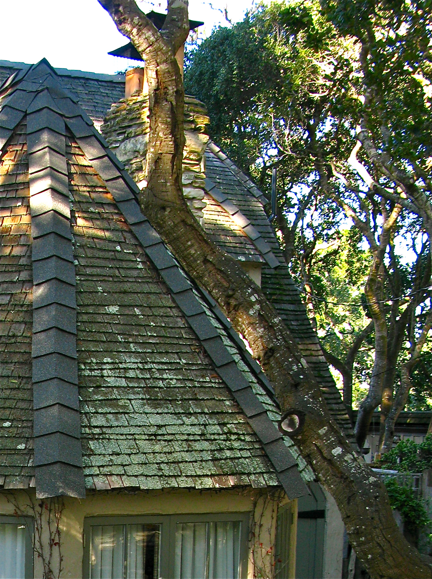 As I have mentioned before, trees take precedence over homes in Carmel. You can see that the steep roof just clears this large branch of an oak tree.