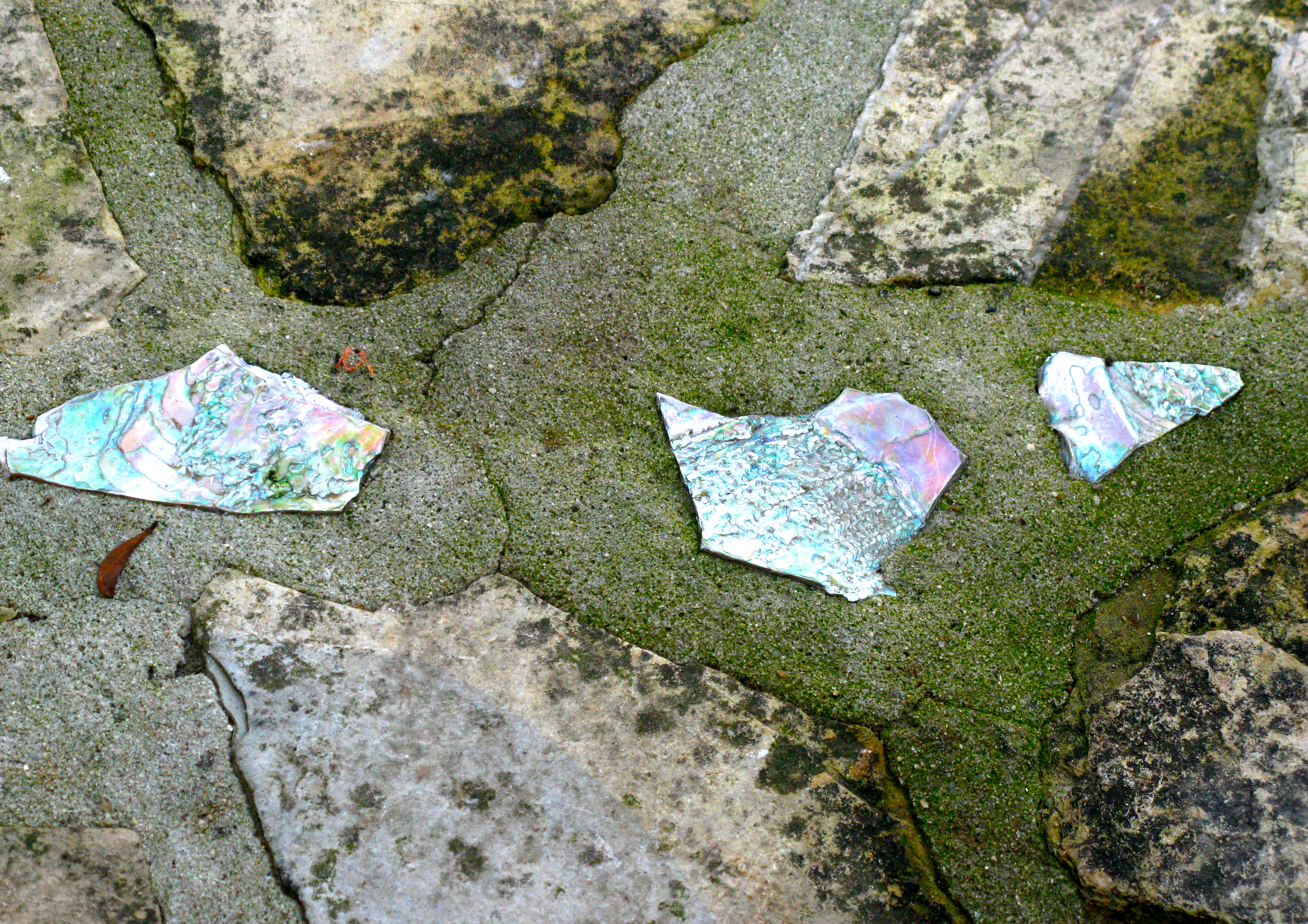 The entrance is on the south side of the home and is reached by walking down a flight of stairs to the stone patio which is interlaced with iridescent abalone shells.
