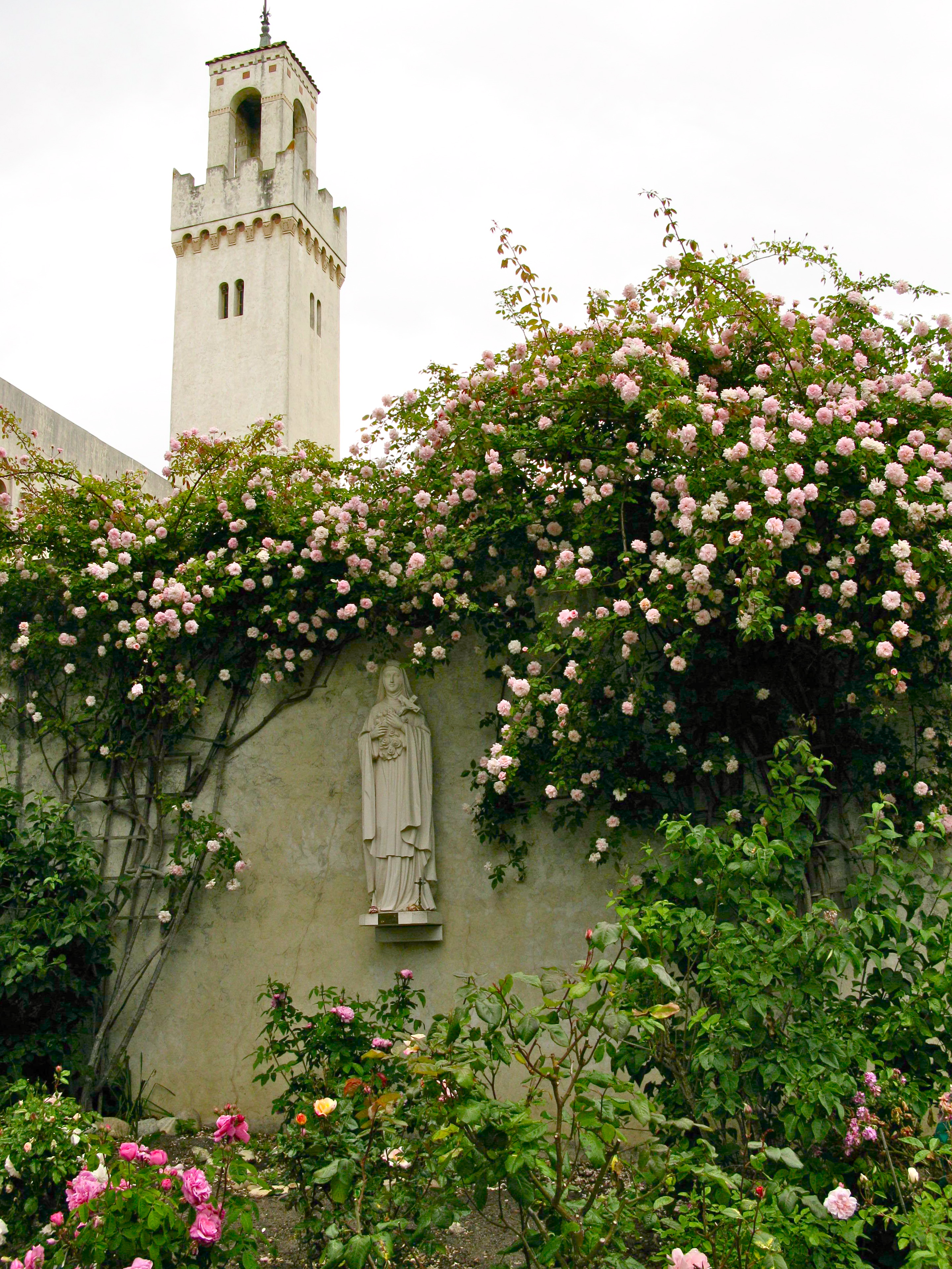 Whizzing toward Carmel one day, I spot a well-worn road going up the hill toward the church and so I make a quick right and go ahead. The Church and its grounds seem deserted , yet I can tell it is occupied. I tour around and find a parking lot.