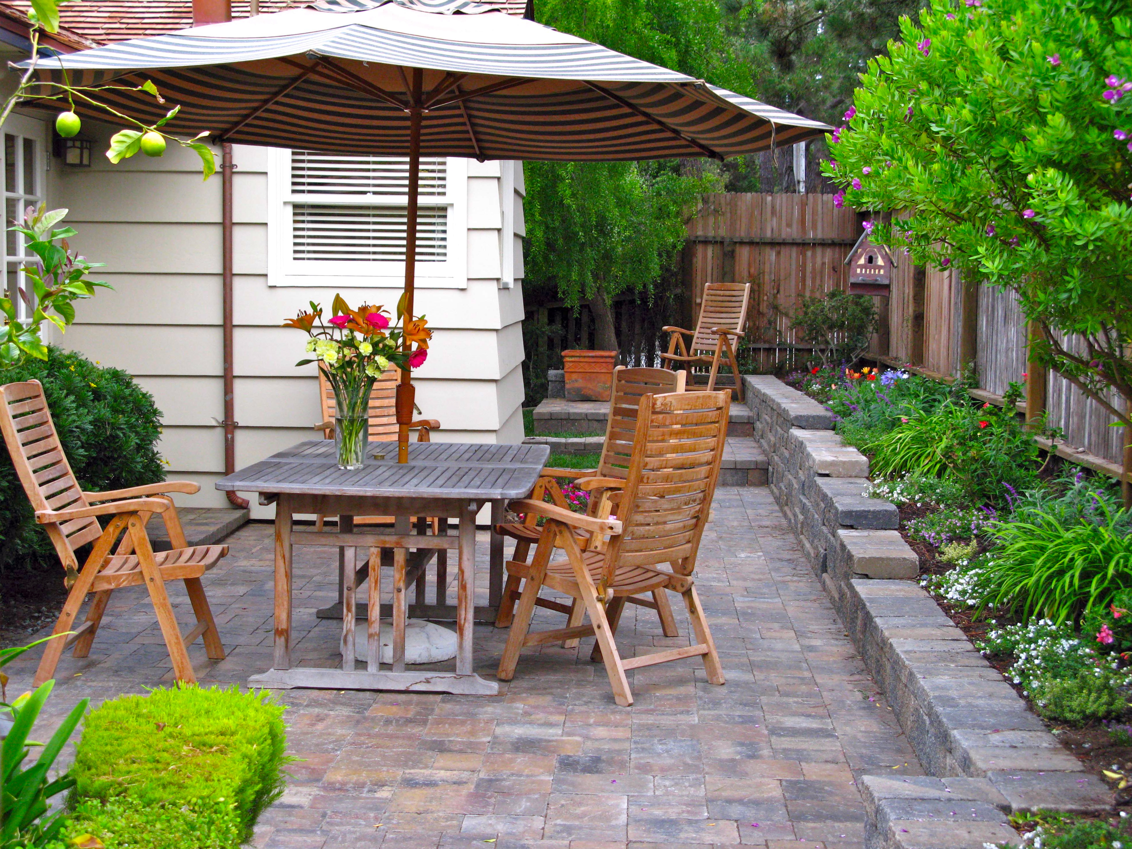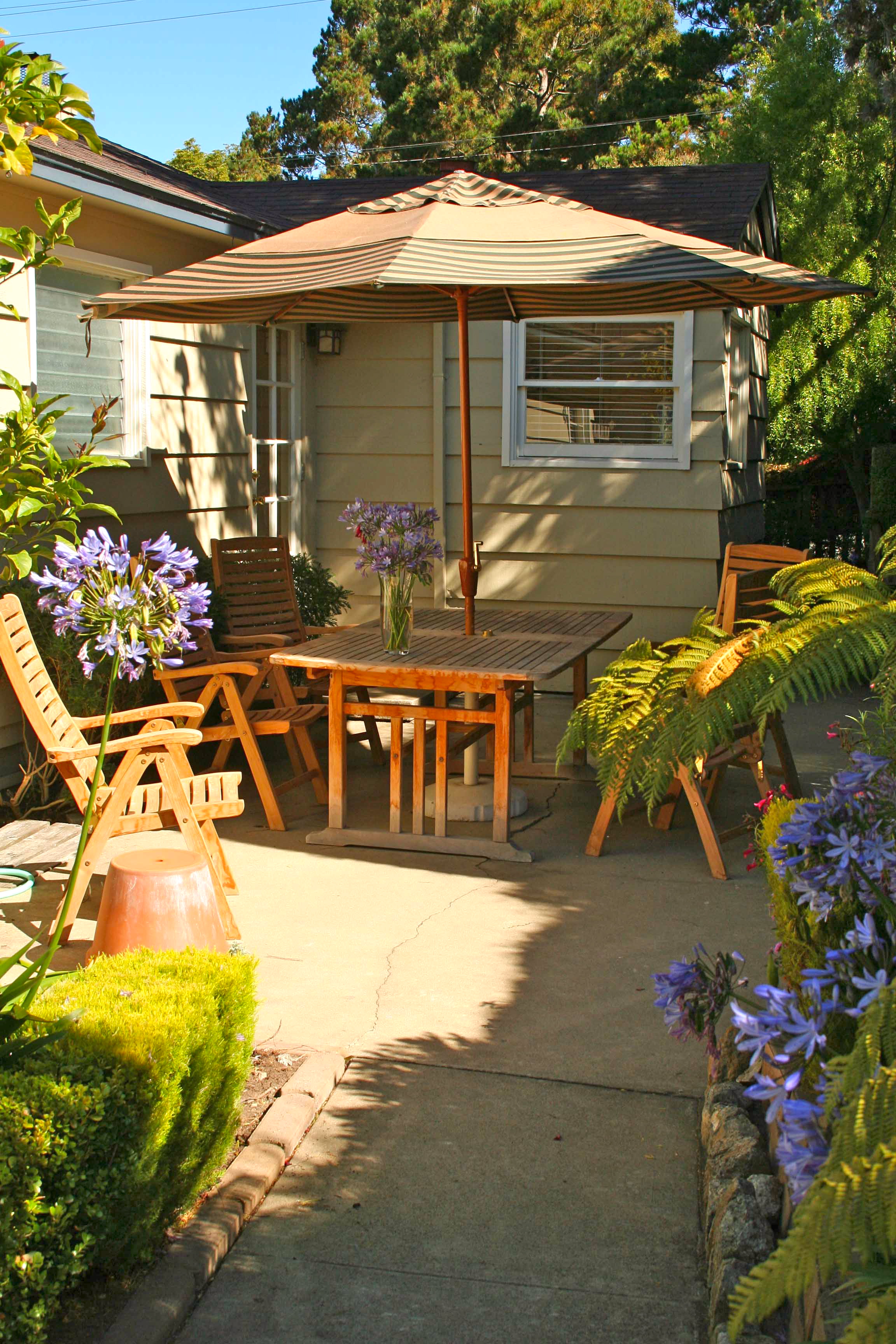 We proceeded very slowly on the patio. Our plastic furniture was replaced with a handsome teak table and chairs from a local store and the umbrella provided a roof extending from the house almost to the fence.