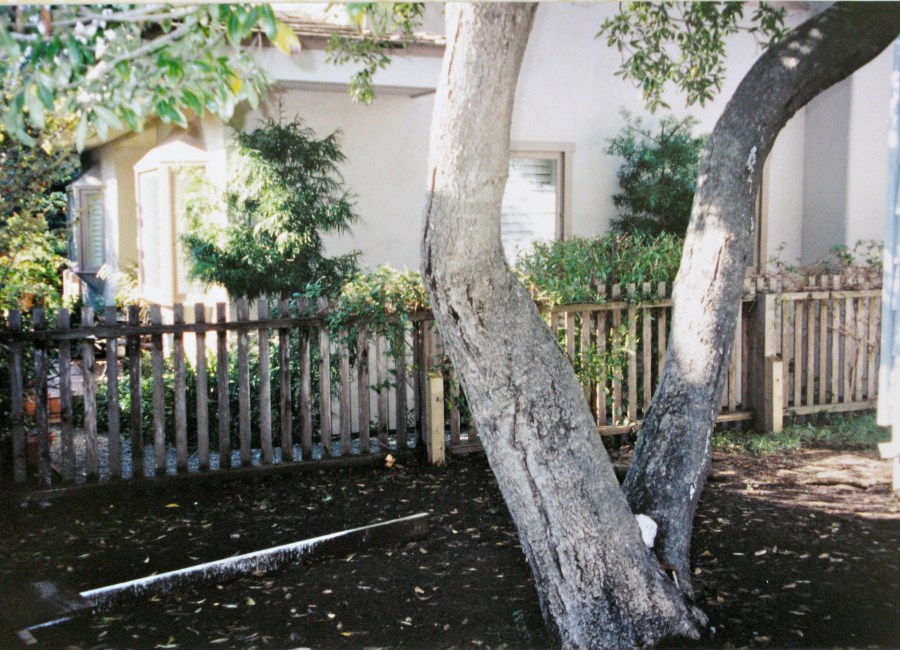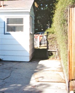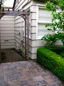 The garage is detached and we are still trying to think of a creative way to use that wasted space between the garage and bedroom. For the time being it is framed by an arbor. The little tree to the right is grafted and produces both lemons and limes.