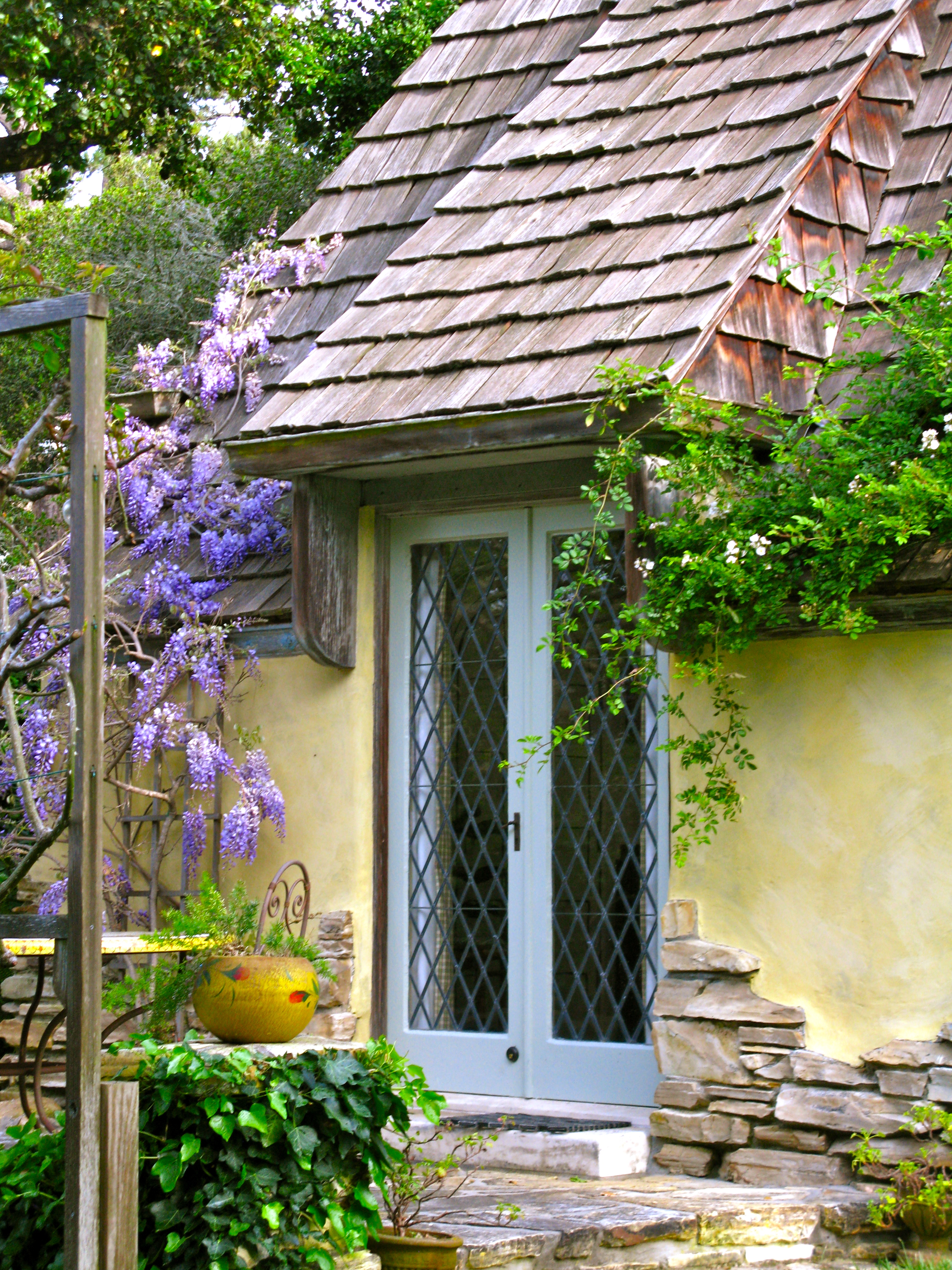 The west part shows off french doors with diamond shaped leaded glass windows. The doors open on the main patio. The wisteria is in bloom and Clematis “montana” is cascades gracefully over the roof. The chimney is another masterpiece fashioned of Carmel Stone.