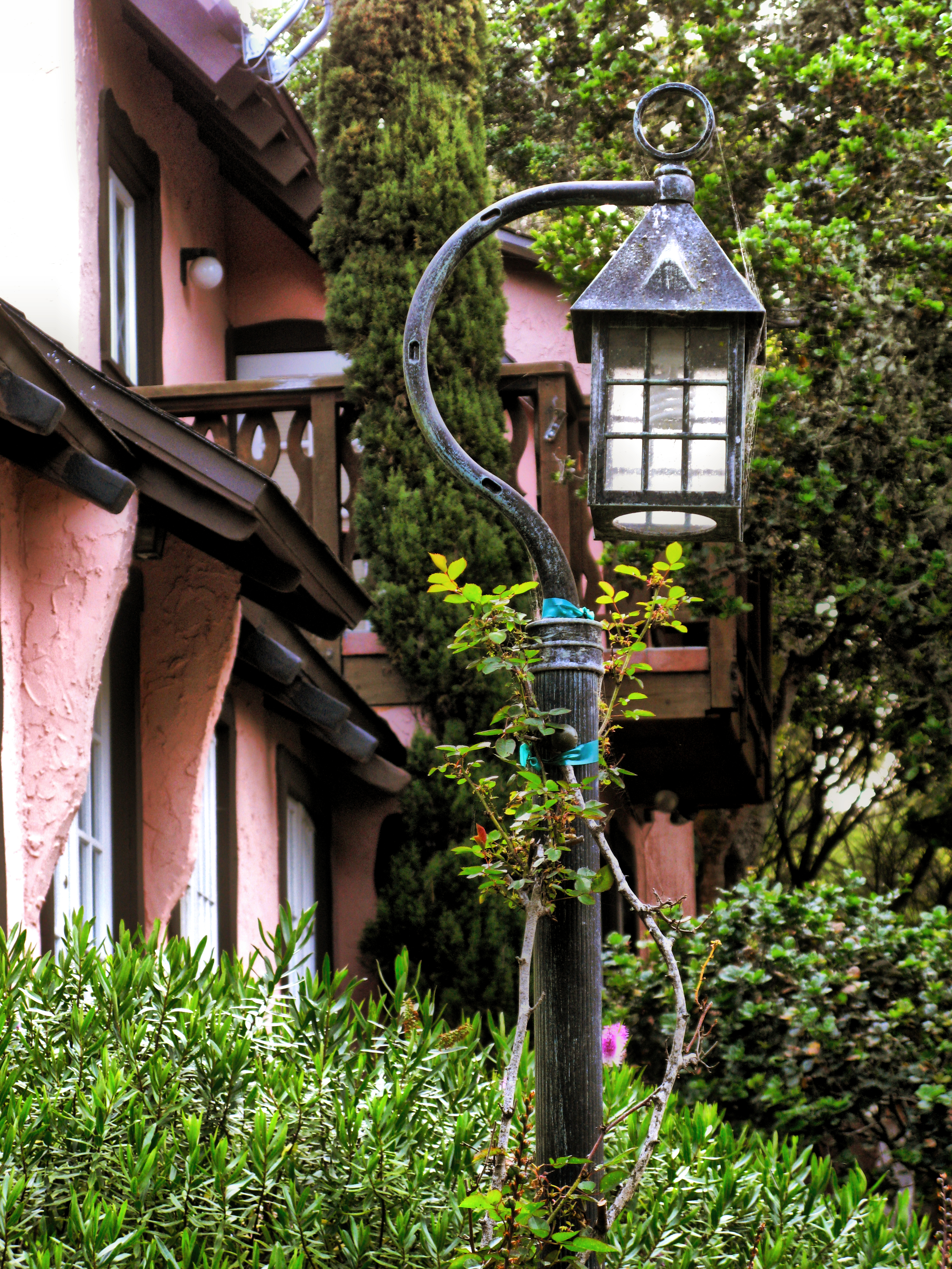 I am strolling up Santa Fe and I am “on a roll”. I have located and photographed 7 Hugh Comstock cottages this morning and am delighted. “Our House” is impossible to get good shots of from the street, so I snap a quick photo and go on. Wait a minute. There is a pink house on the other side of Santa Fe that has to be its twin.