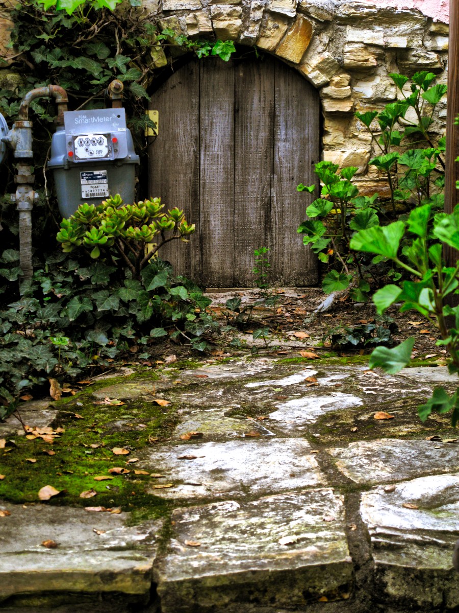 As I go down the driveway , I see this invitingly curved stone path leading to a rustic birdbath.