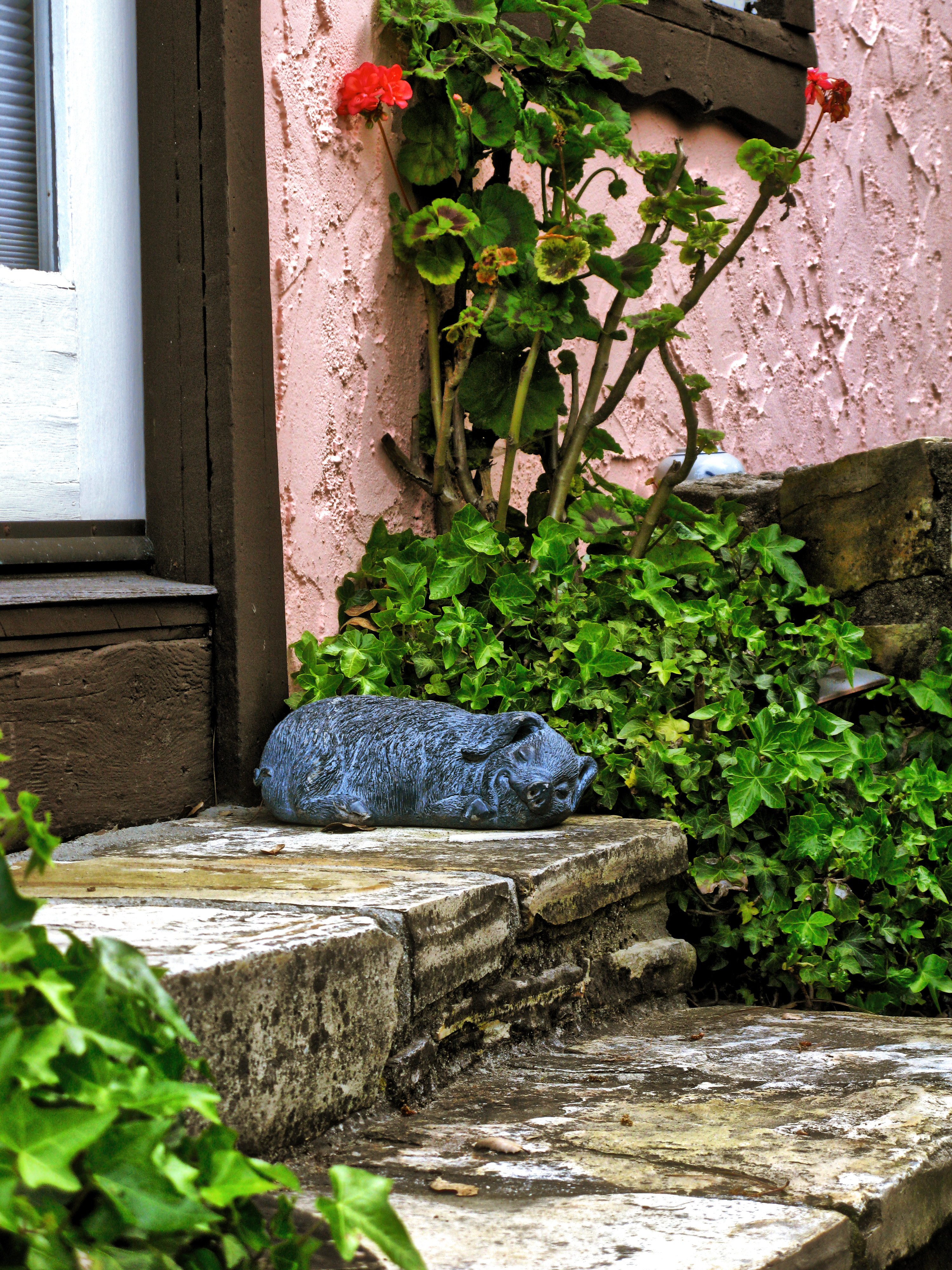 A pig sleeps in the sun and geraniums stretch up to the window sill.
