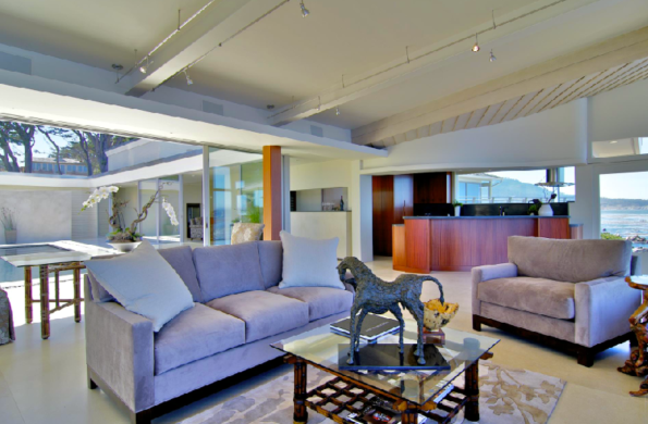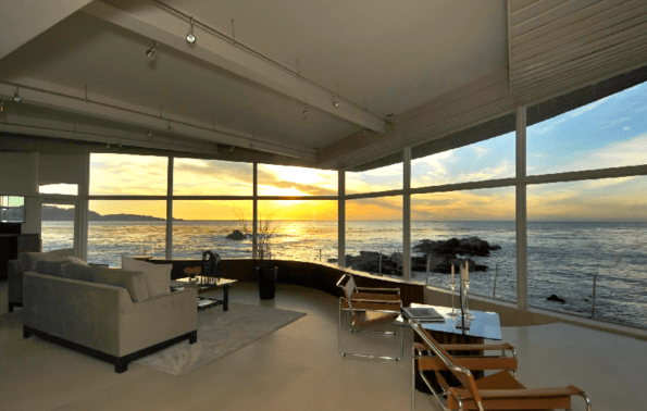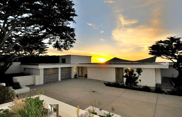 It is a one-story , mid-century Modern residence that sits on a rock outcropping above the Pacific Ocean.
