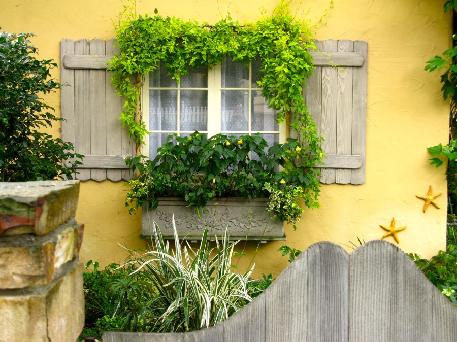 I glance over the garden gate and I WANT this window with its window box, shutters, vining frame and lace curtins