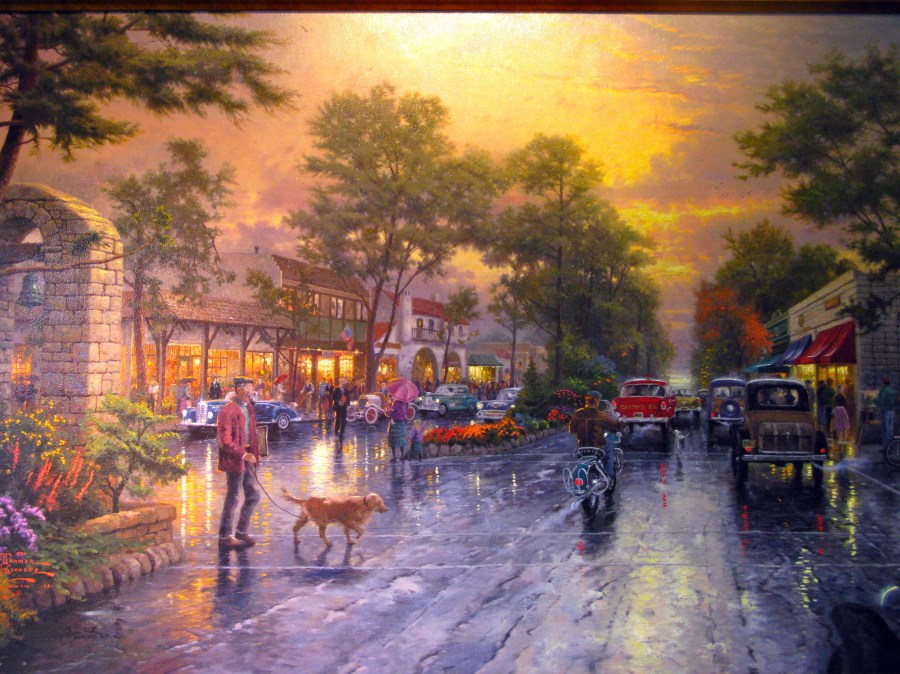 I would so much like to walk along this avenue and enter the narrow lane, it is so beautiful ! I fell in love with the house having the arbor over the patio…So dreamy… And I love Thomas Kinkade paintings, I would surely have a look into the gallery.
