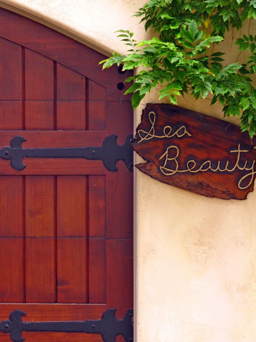 It is Sunday afternoon and Bill and I are walking home from The Mission Ranch, where we have enjoyed the “jazz brunch”.  A jazz combo plays while we go through the brunch line and then eat outside in the sunshine and watch the sheep in the meadow. It is all very civilized. We are walking up the hill toward home and spot SEA BEAUTY with a for sale sign in her front yard. I decide to come back later with my camera and capture some of her charms for you.