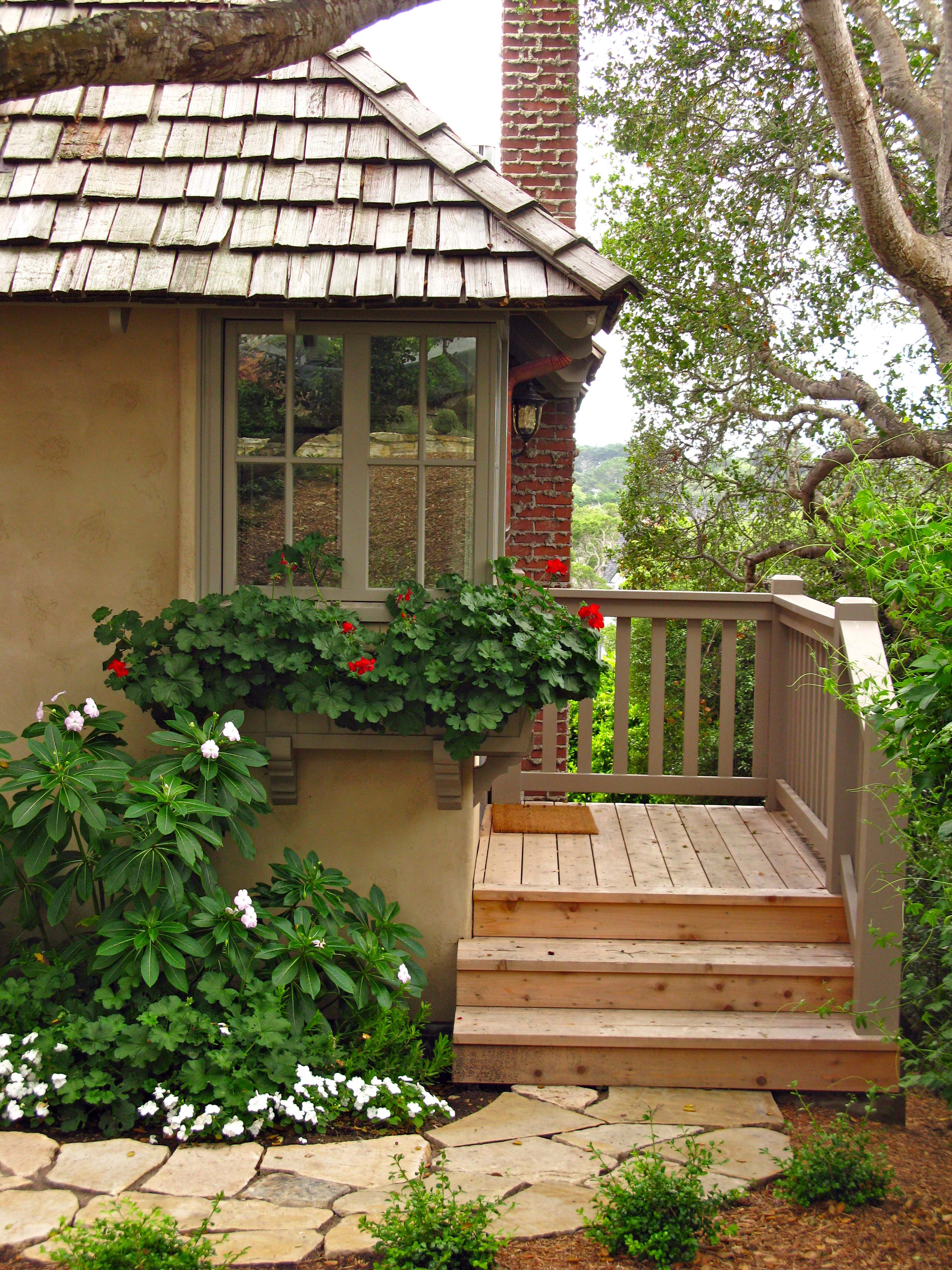 The path is Carmel stone and the front porch is a treasure of fine  wood, details and potted plants.