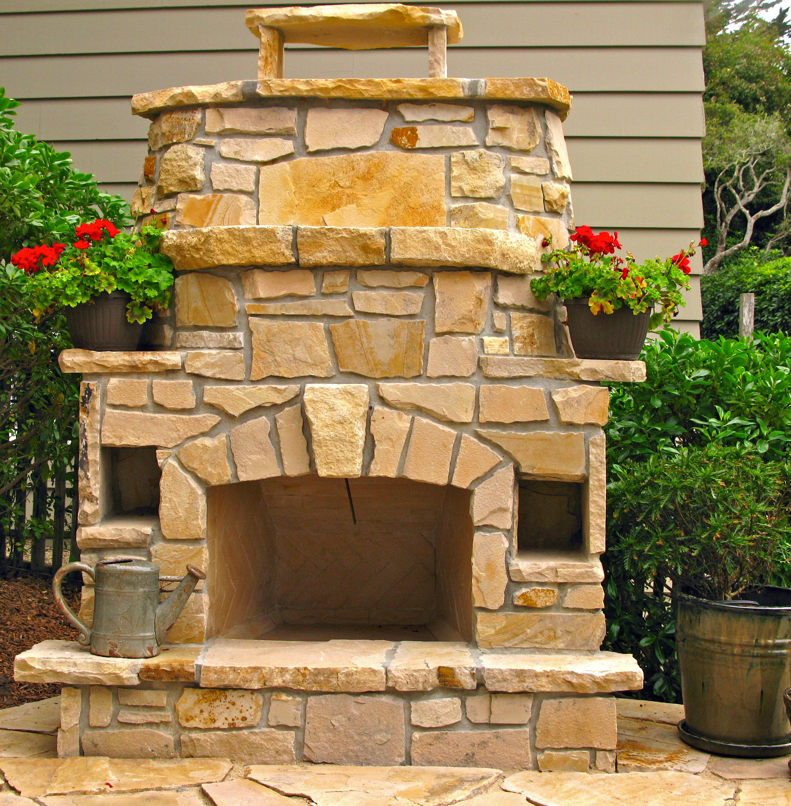 A outdoor fireplace is the focal point.