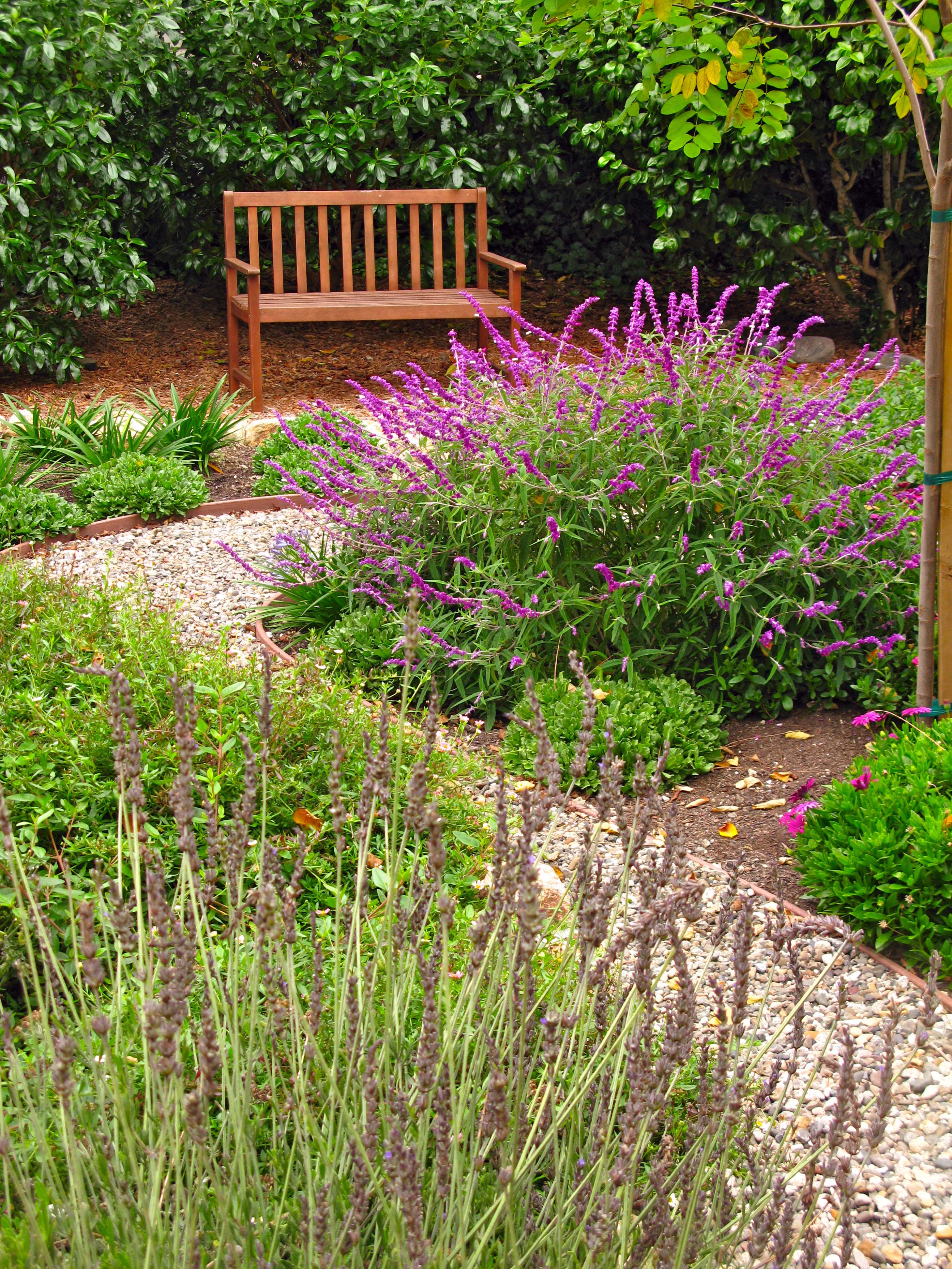 Leads to a bench at the bottom of the yard