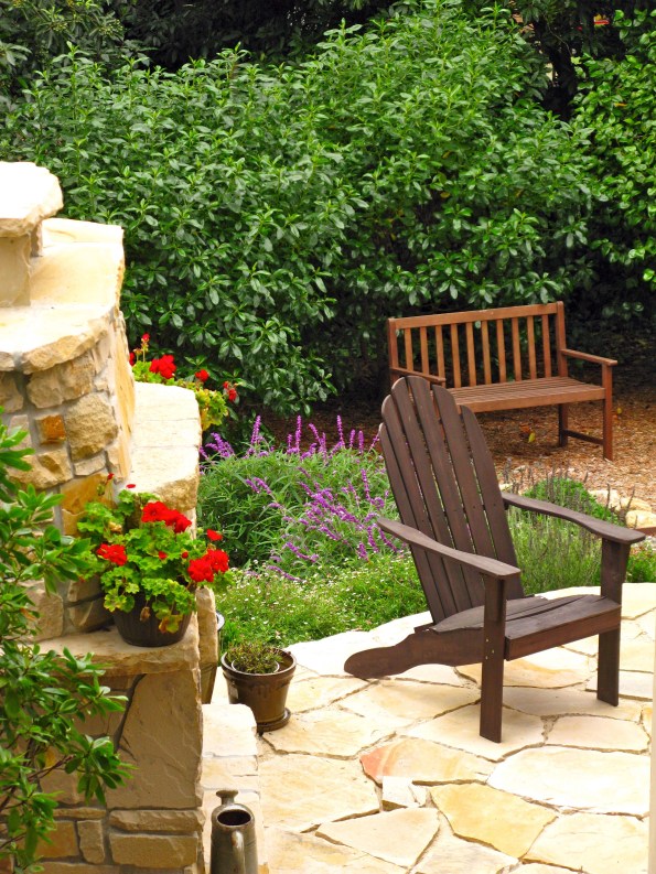 The path is Carmel stone and the front porch is a treasure of fine wood, details and potted plants.