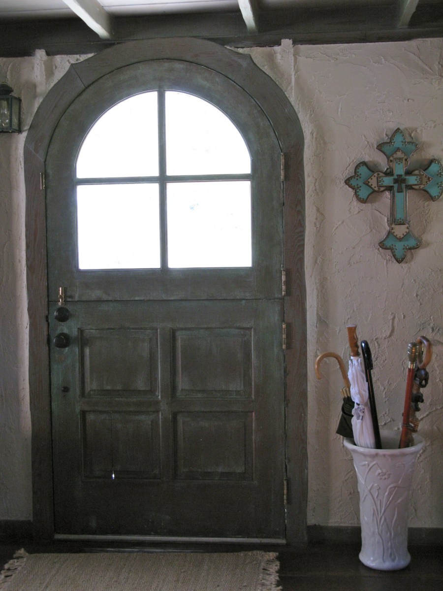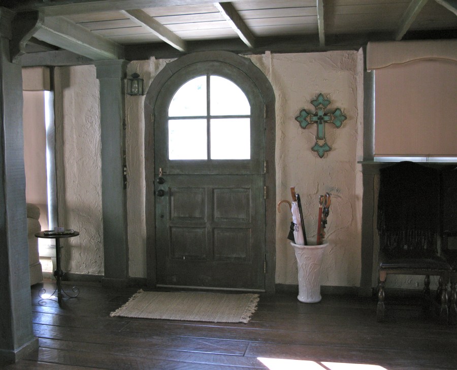 Soft light illuminates the entry with its distinctive front door and wide planked wooden floor.
