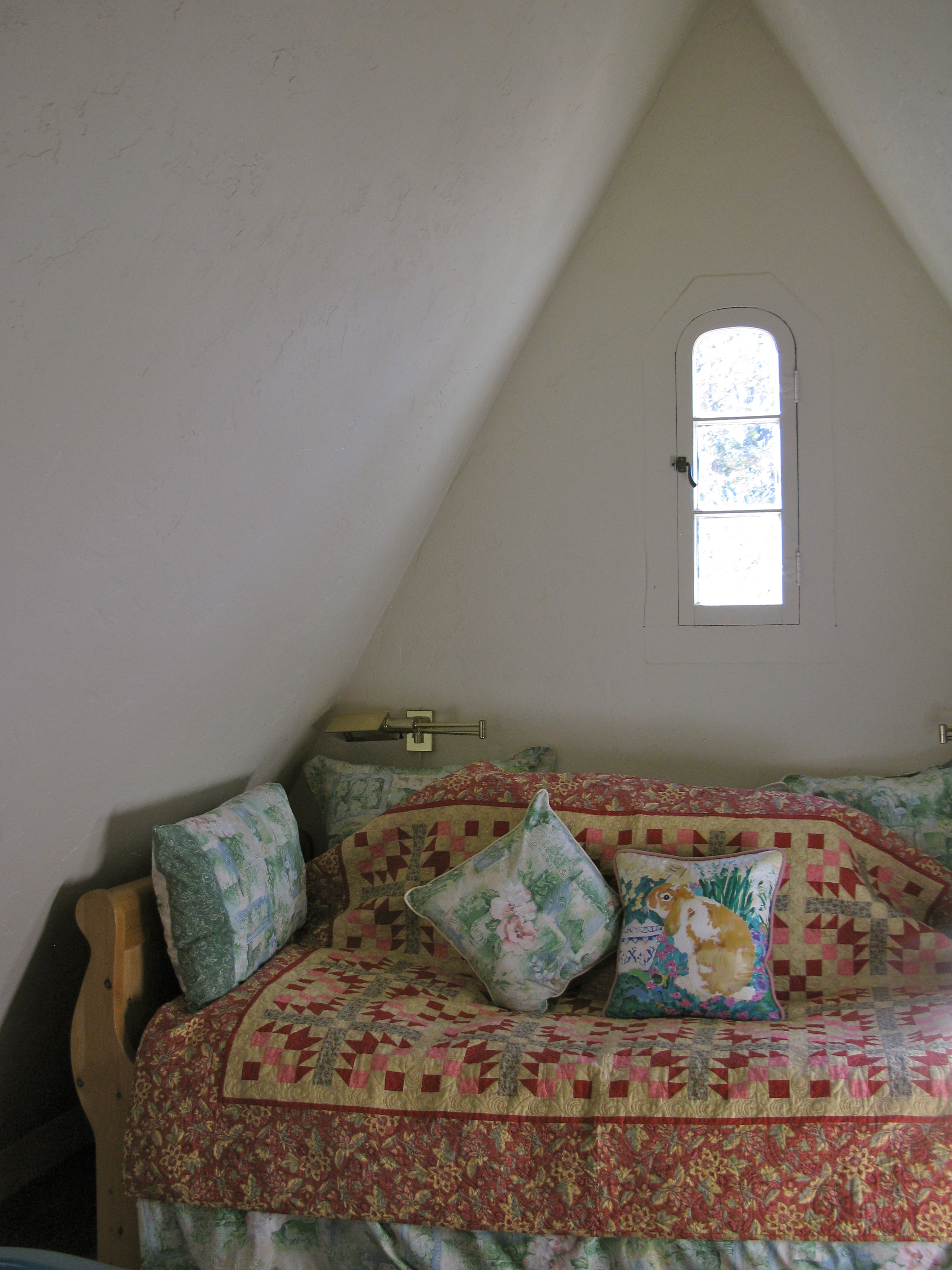 Ahead is the room that has the window I love so much. Furniture snuggles under the high-pitched eves.
