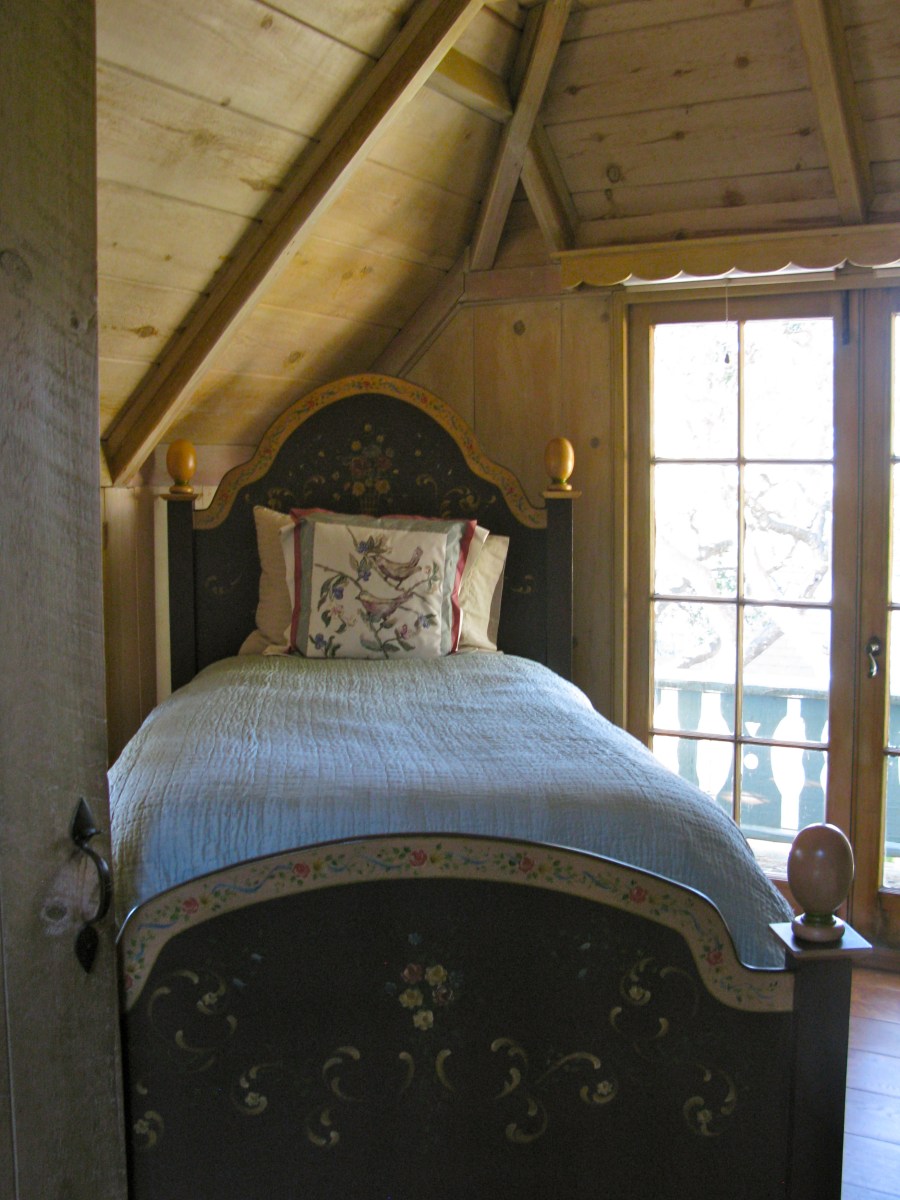 Now a bedroom, Hugh built this room as Mayotta’s sewing room ( remember she is the creator of the “otsy-totsy” dolls. French doors open to a balcony with a garden view.