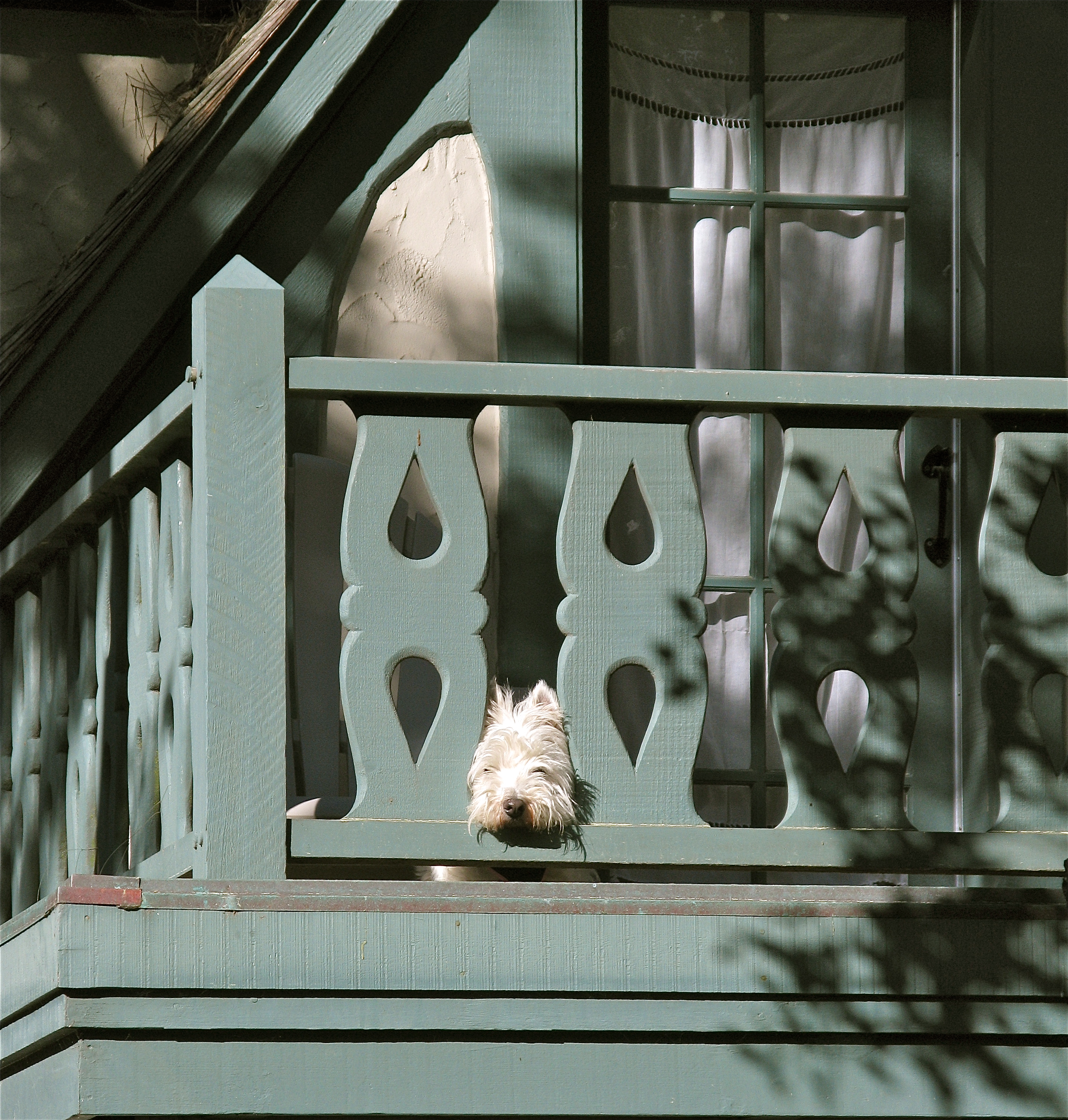 Lovely home. Love the decorating,… the marble in the kitchen, the view, and most of all, the white dog on the upper porch. How sweet that her business is named after her dog!