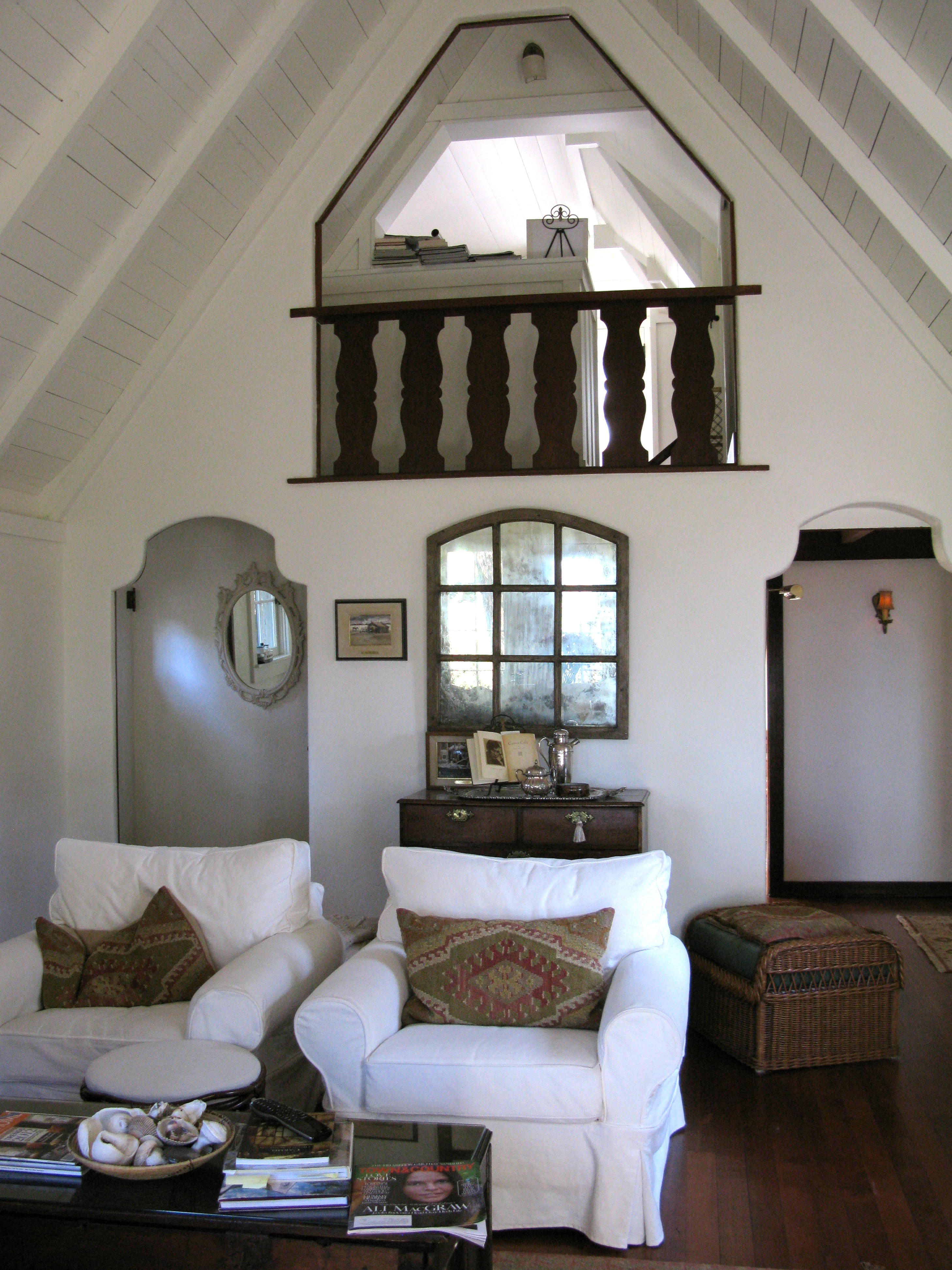 Every thing about this cottage seems feminine. From here stairs to the right lead to the loft and a door to the left opens to a patio.