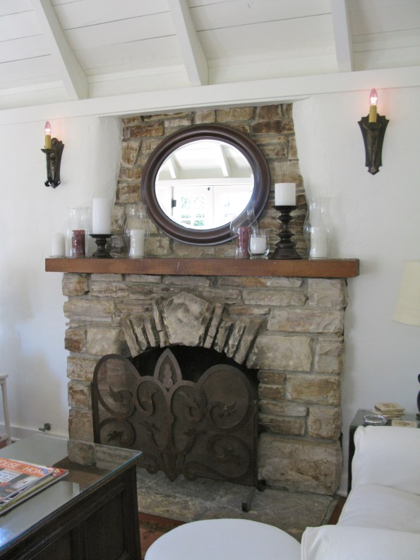 The stone fireplace is as Mr. Comstock built it flanked by antique light fixtures  authentic to the time it was built.