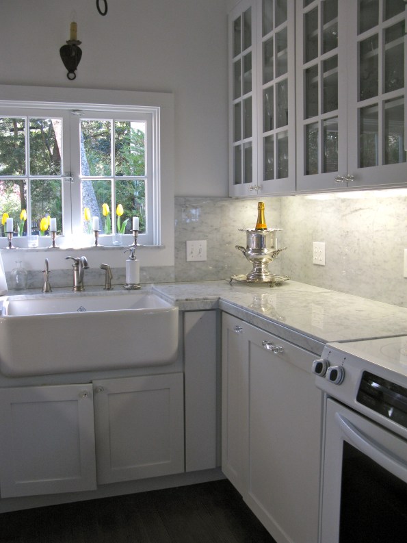 She leads me into the kitchen. It is stunning with its white Carrara Marble countertops and  back splash,