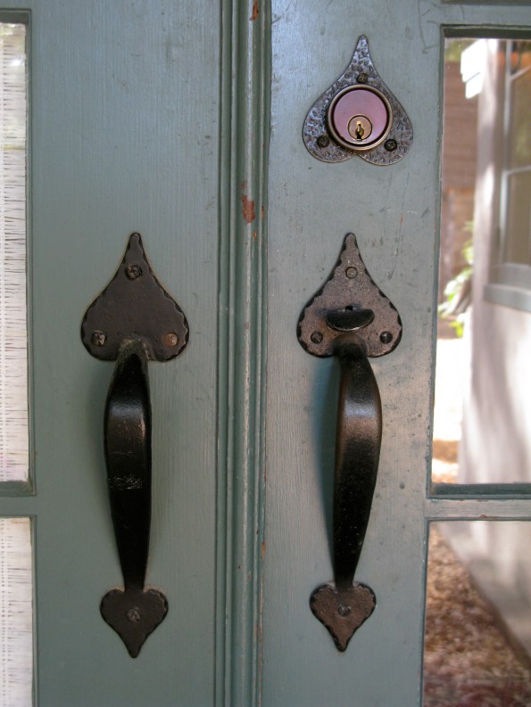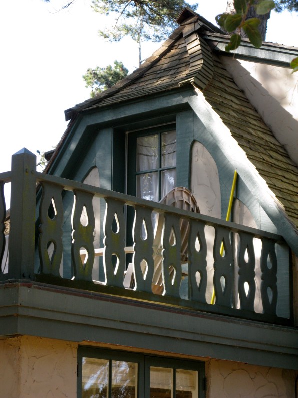 I am still “Comstock hunting” when I discover Curtain Call. The little cottage is being renovated and so I slip in through the gate and start toward the front door. What a captivating roof line , very steep with flared eves and undulating ridge lines.