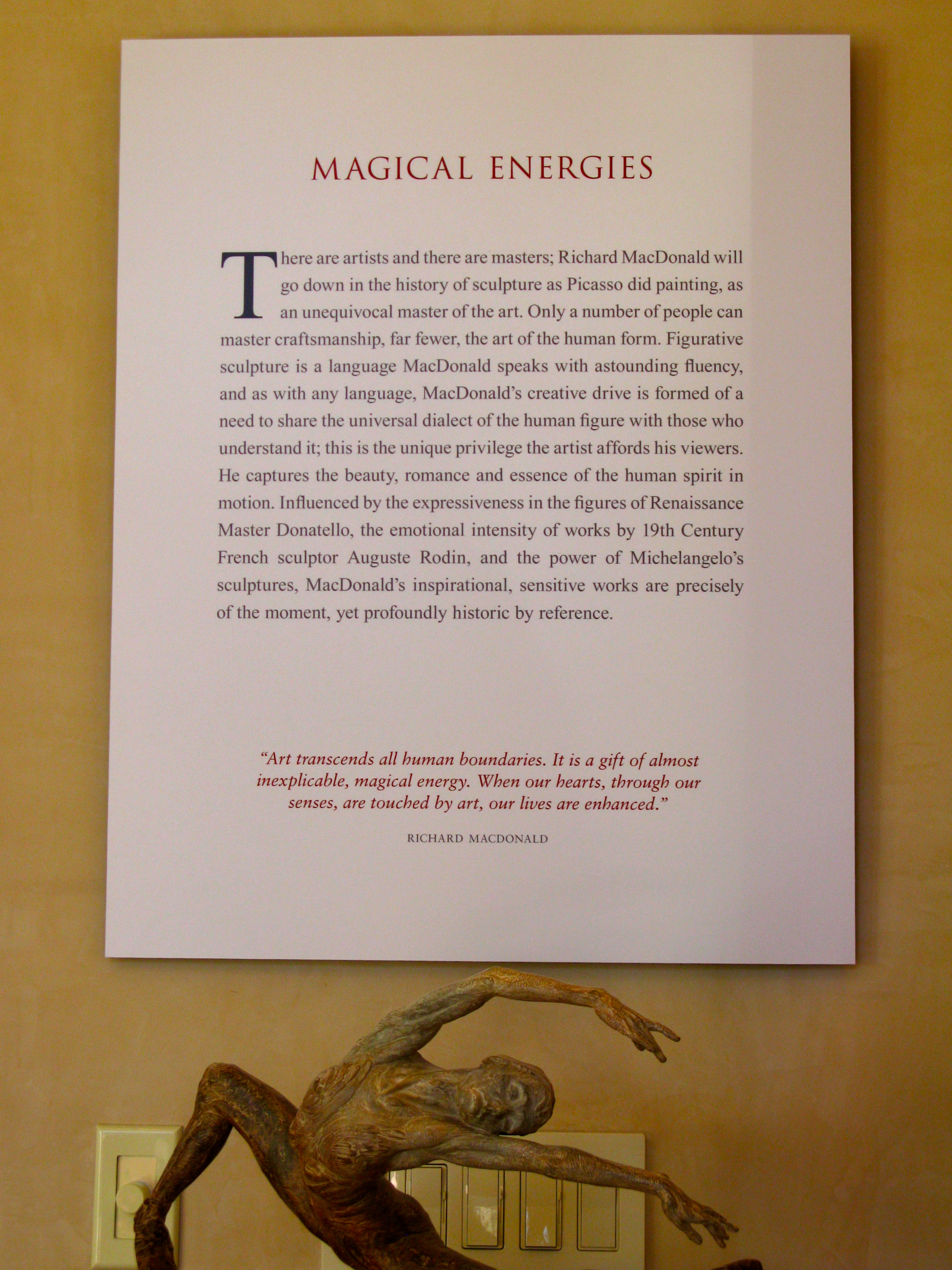 Our second stop is the beautiful gallery of Richard McDonald. http://www.richardmacdonald.com/. World  renowned, Carmel enjoys a first look at each new show. In the past I see Sculpture inspired by The Cirque de Soleil and The Royal Ballet. Today we see his Magical Energies show. As with all the others it is a lovesong to the beauty of the human body in movement.