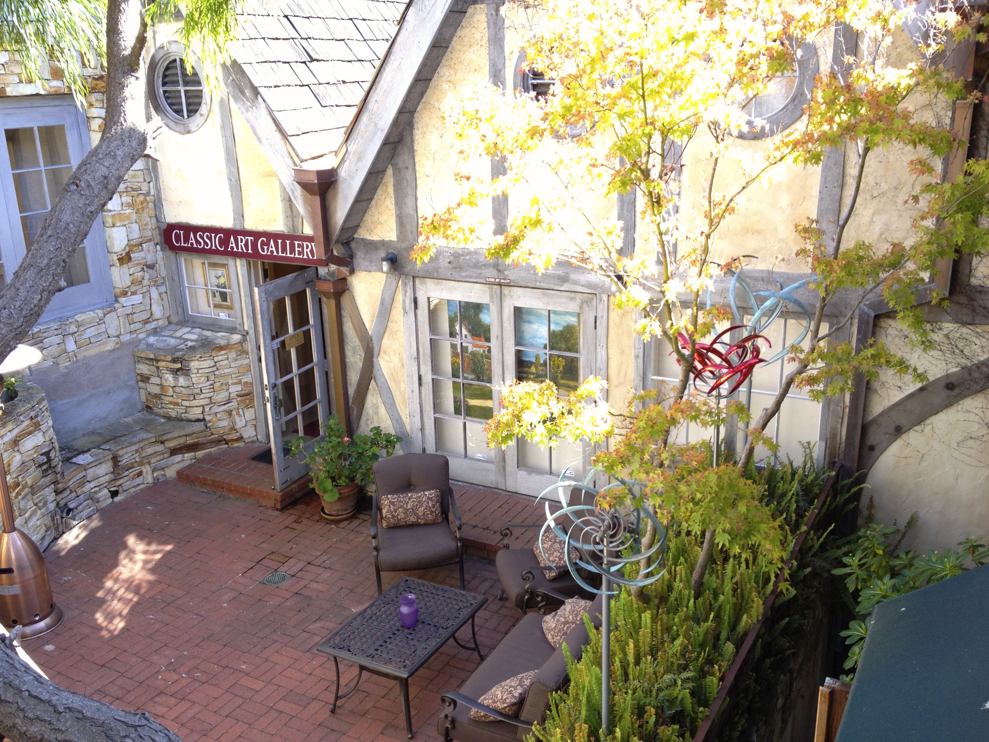 The Classic Art Gallery open to this pleasant space with patio furniture, brick floor, plantings and art.
