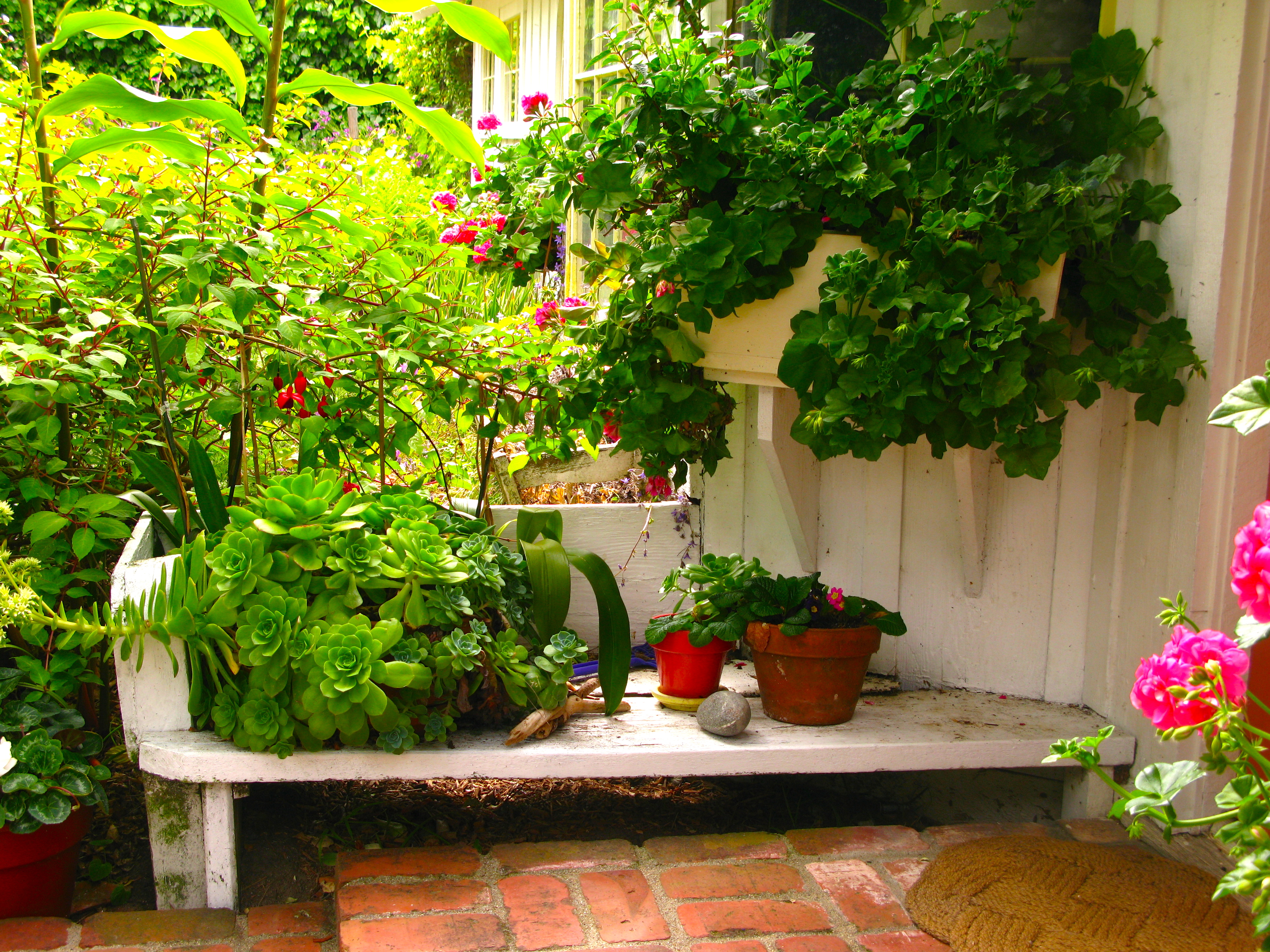 To the east is this tiered planter filled with potted succulents and cyclamen .