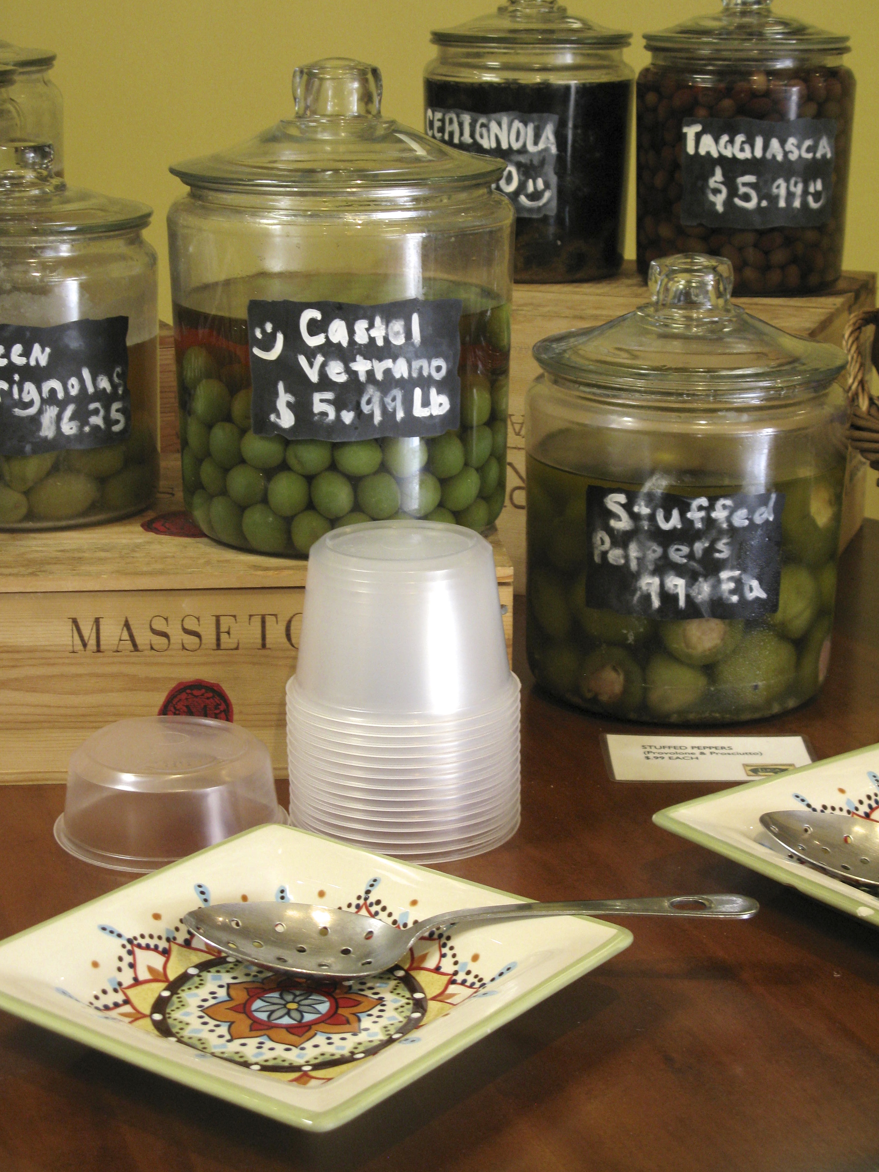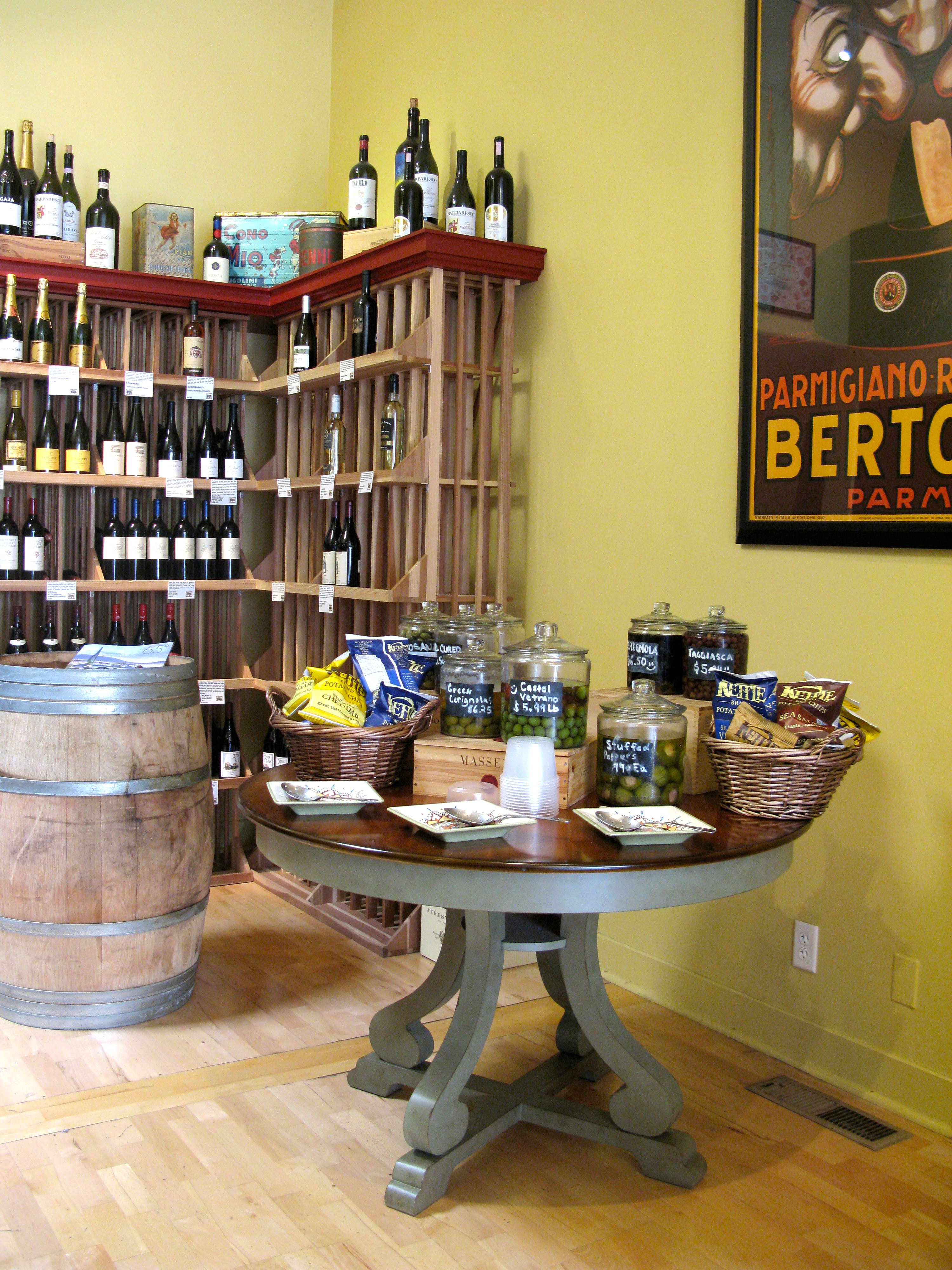 At the cheese shop we taste cheese from Italy, England, and good old Monterey.