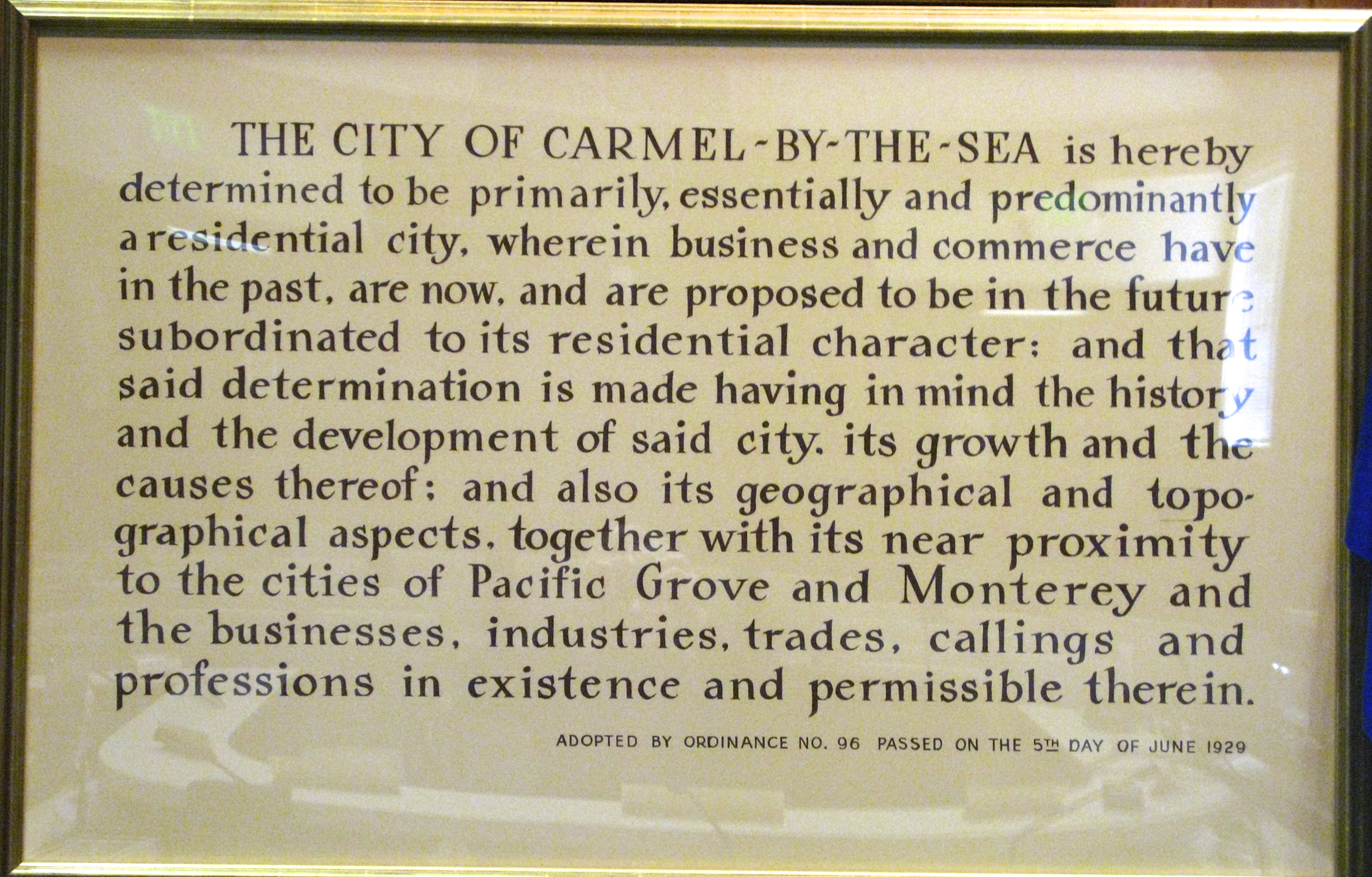 Ah, if it were only that simple to decide what is right and just. In June 1920, The City of Carmel-By-The Sea adopts an ordinance declaring it is to be primarily a residential city, wherein business and commerce are subordinated to its residential character.