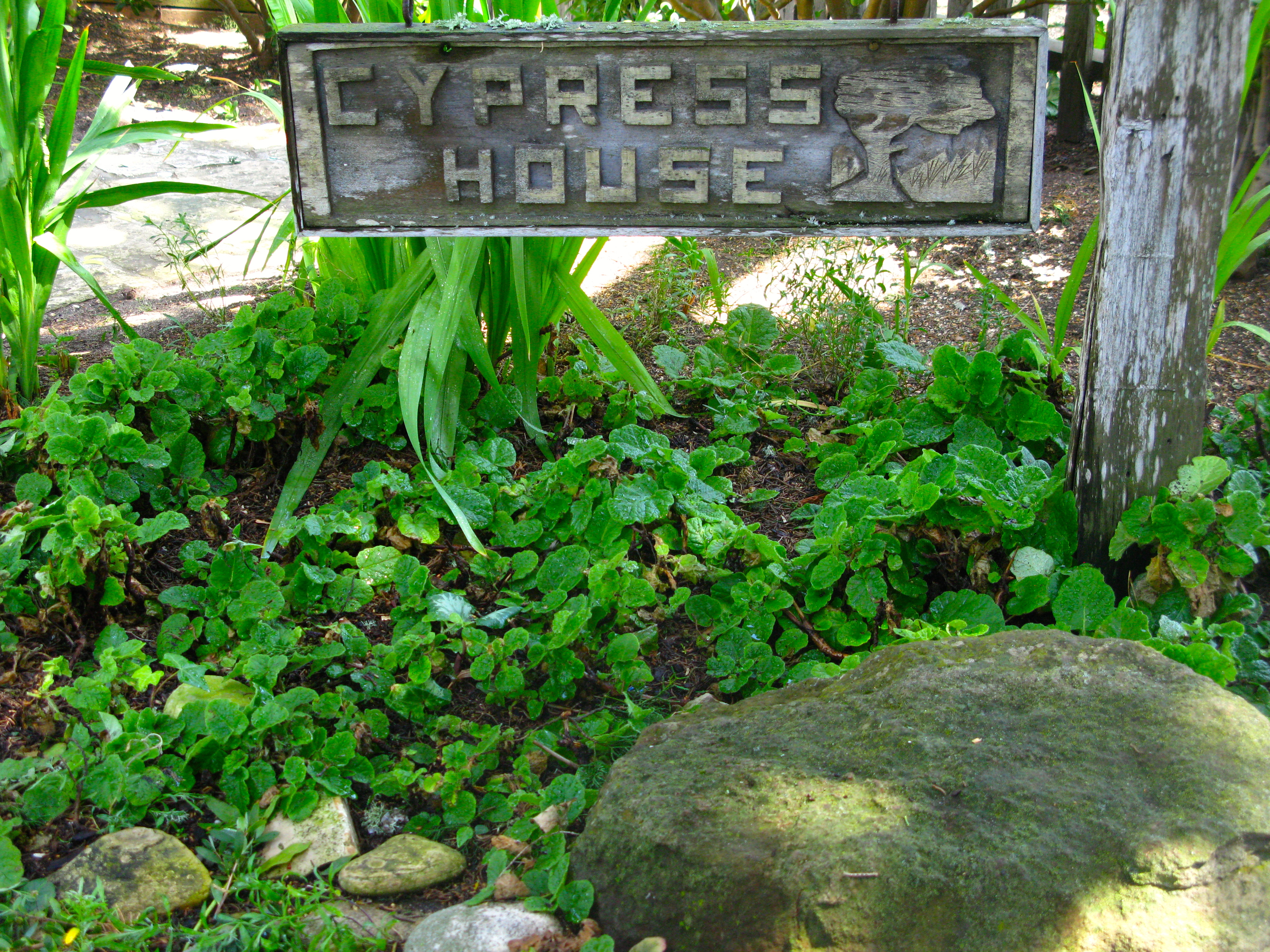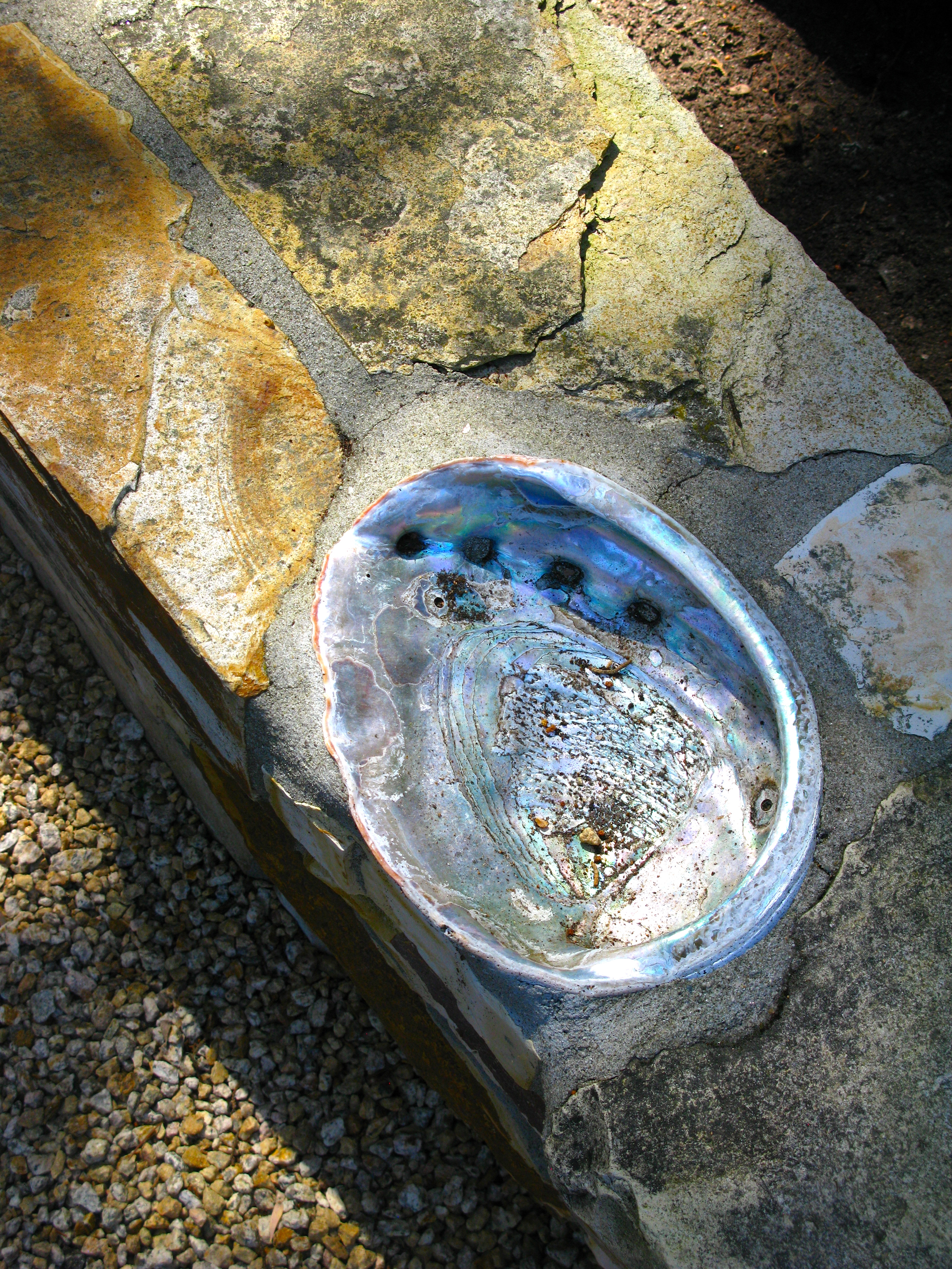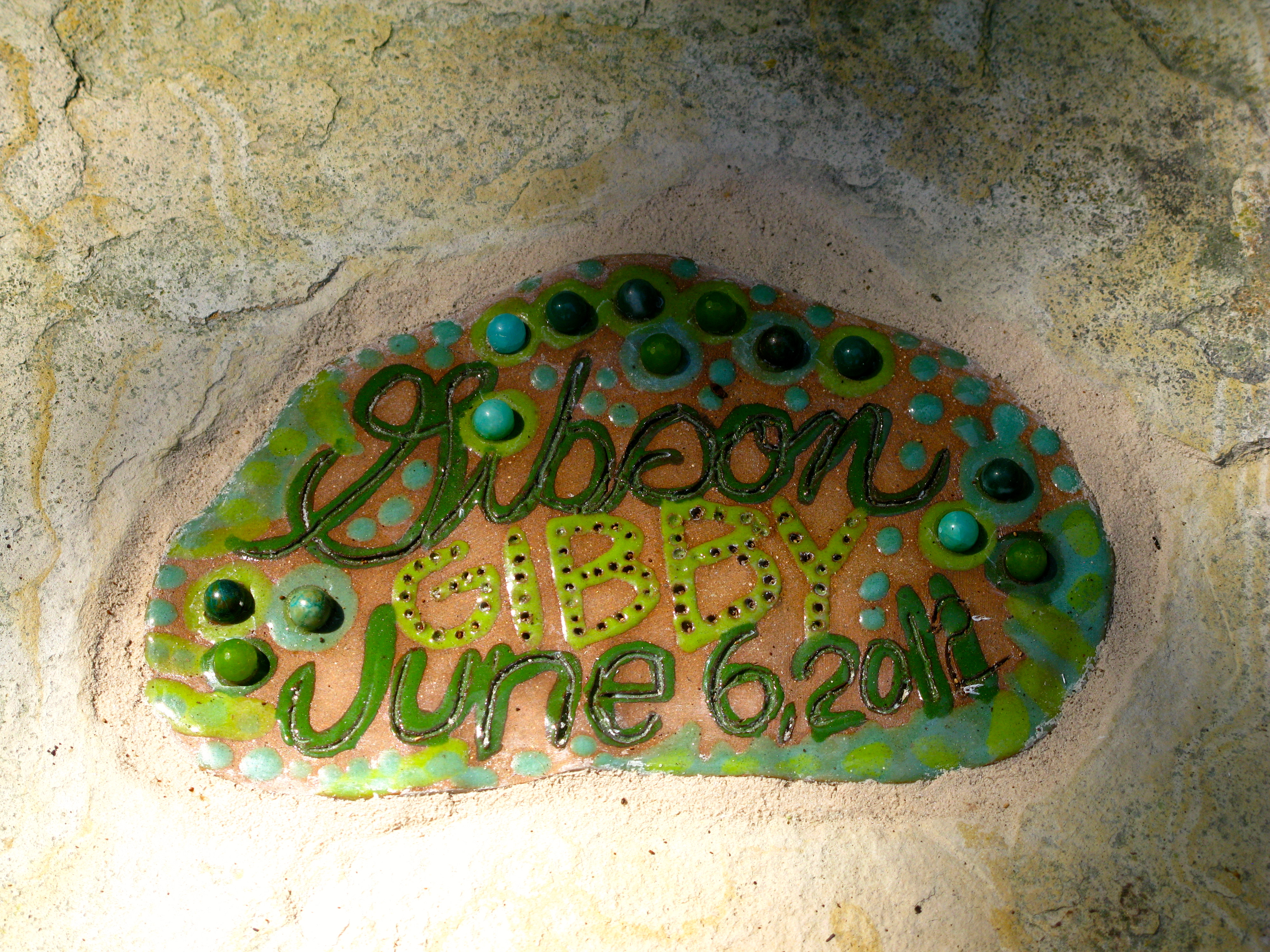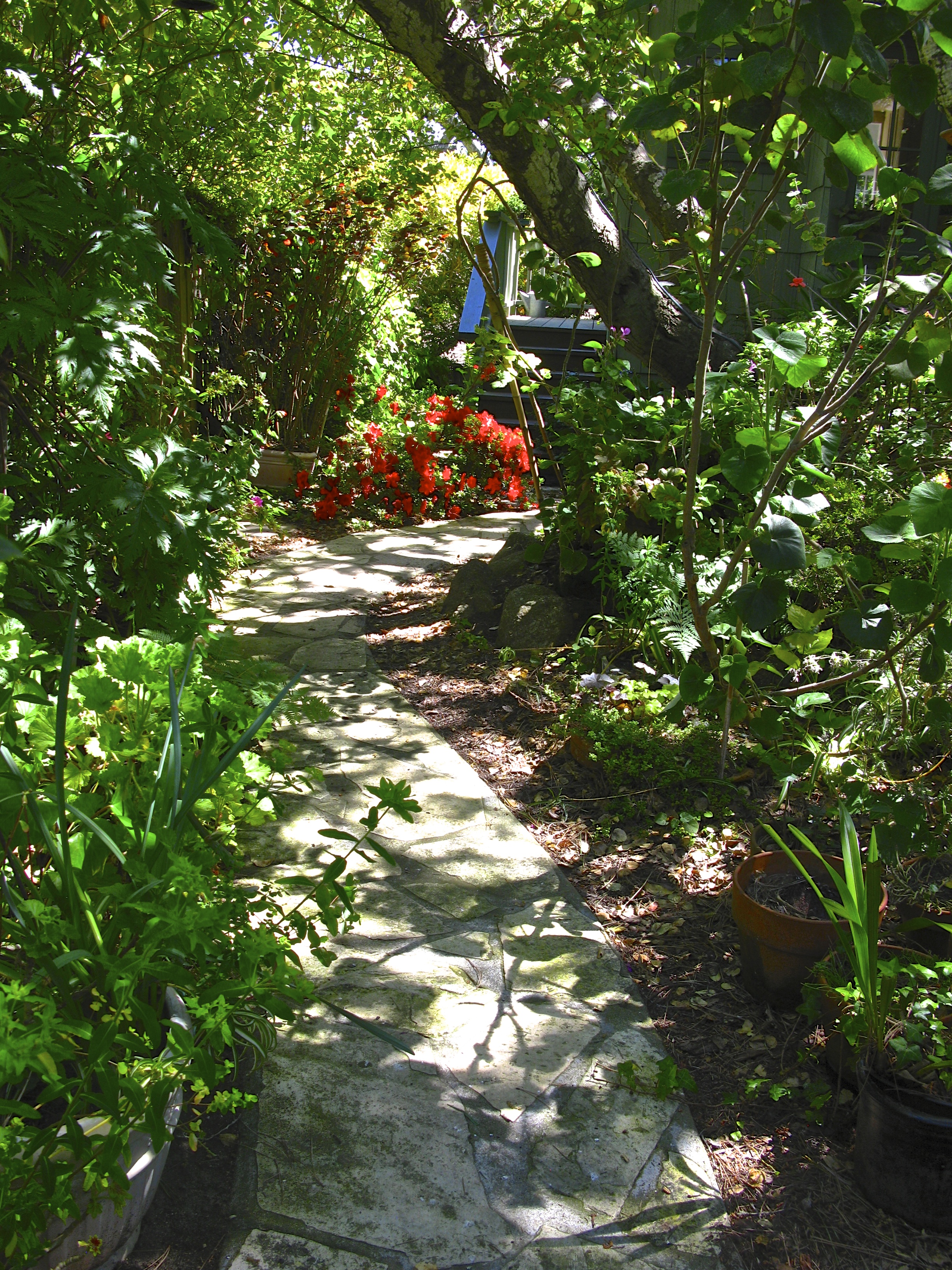 I approach the front door on the flagstone path. Note the colorful name tiles mortared into the stone.