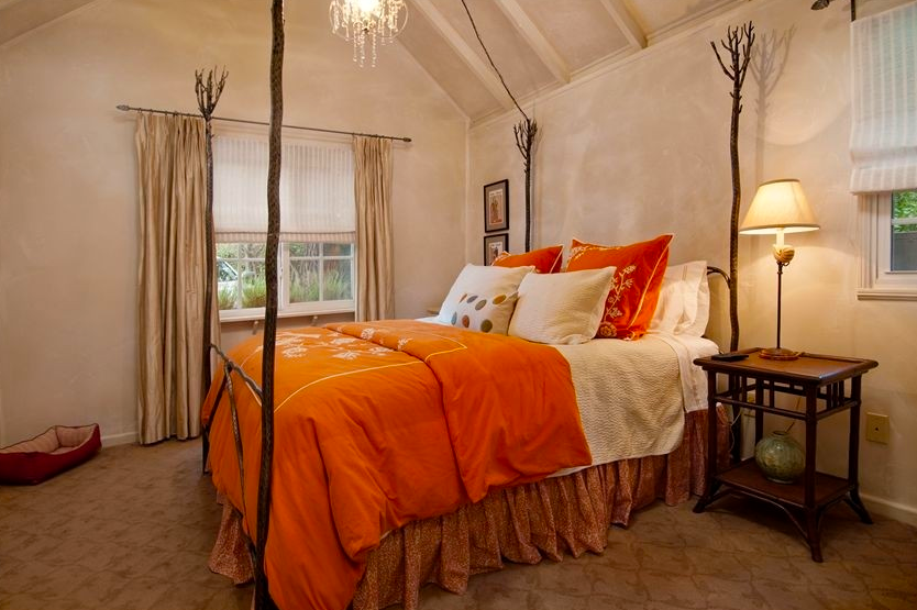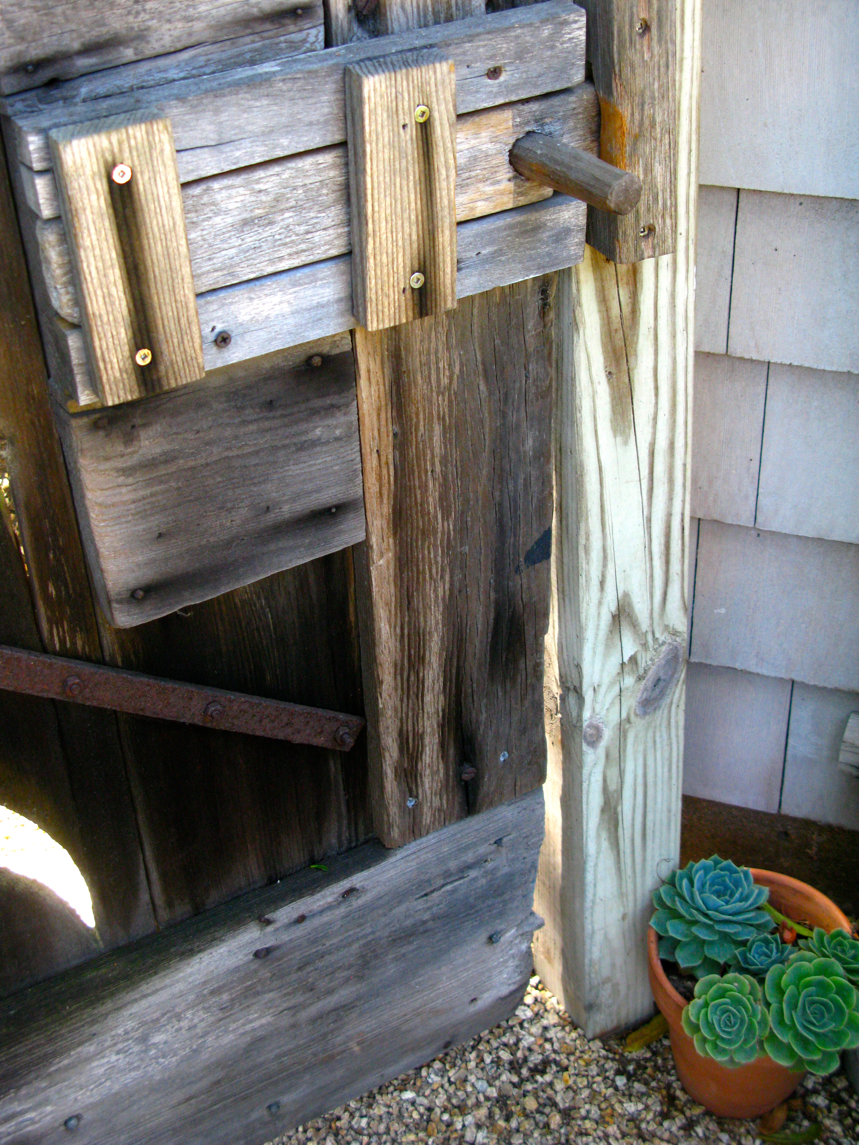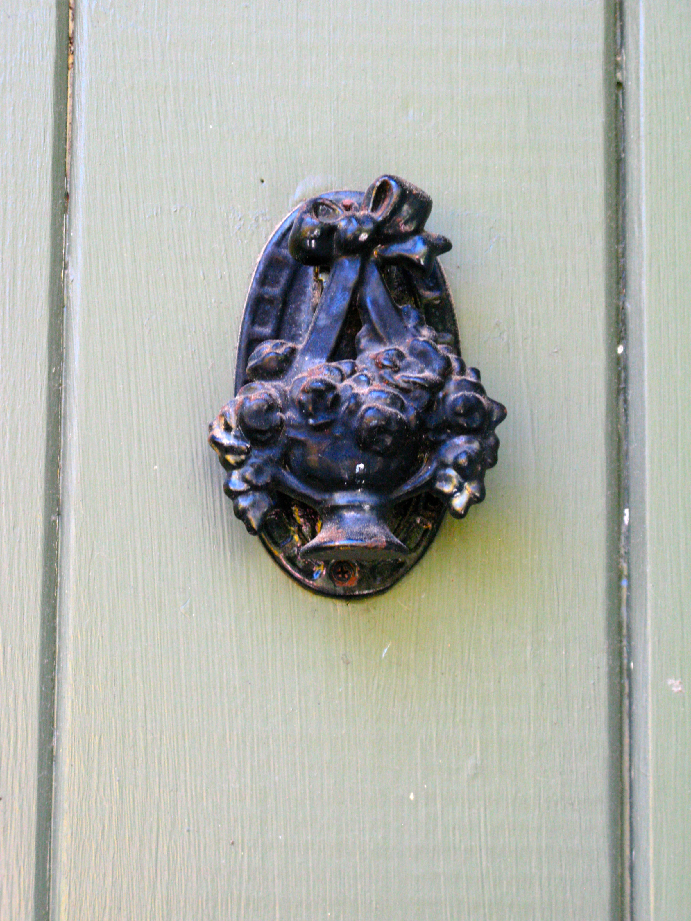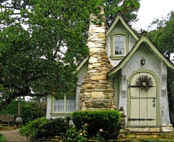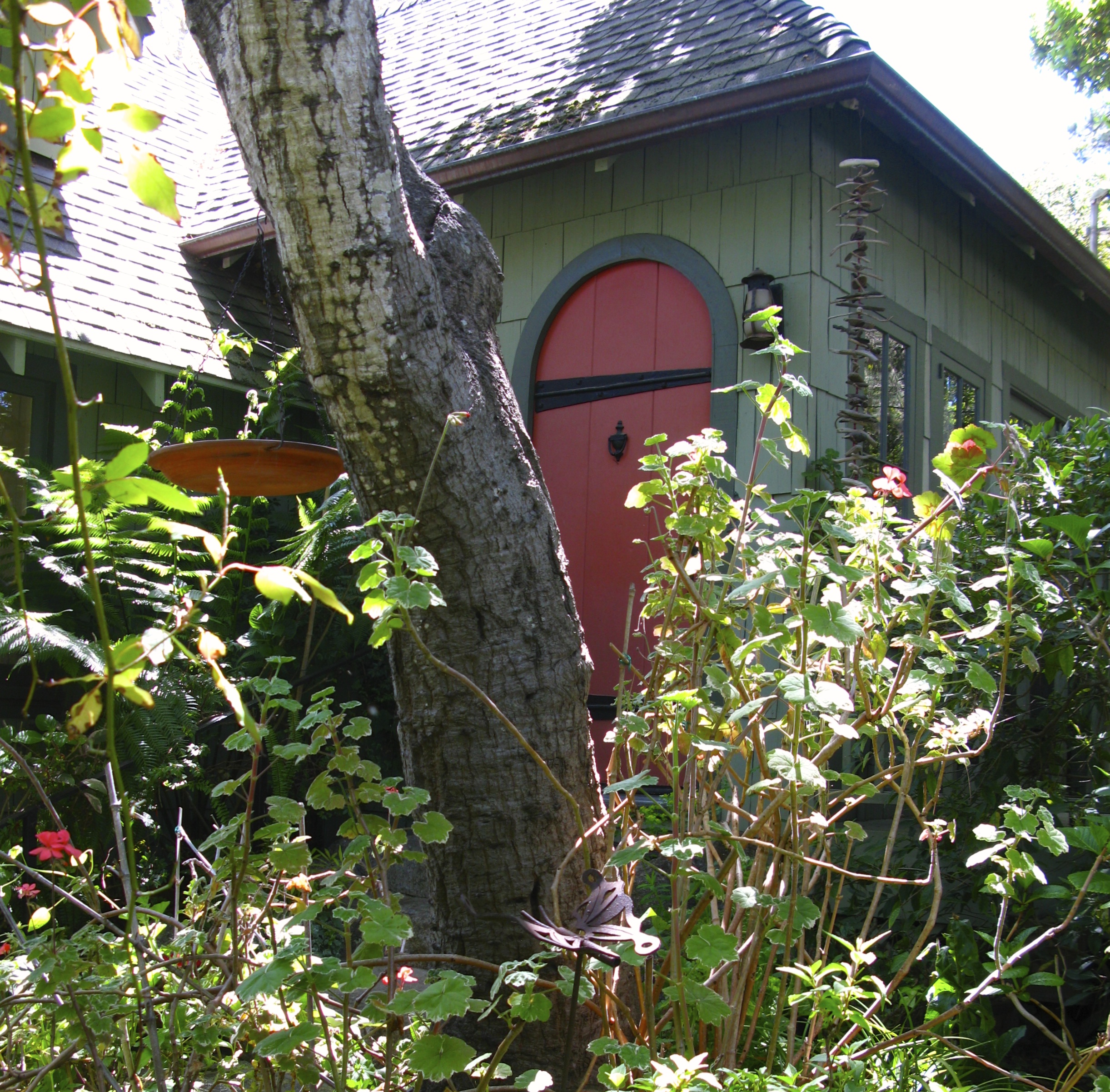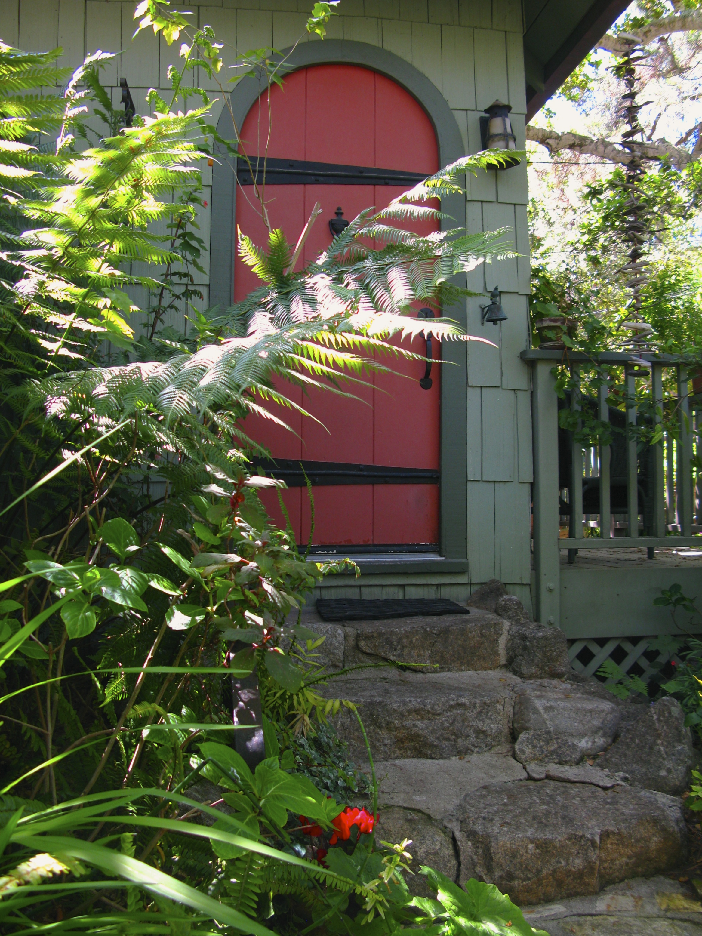 I have long admired this soft-green cottage that blends into it’s oak-shaded lot. The door is arched and planked with large,iron hinges and painted an unexpected bright “poppy” color.