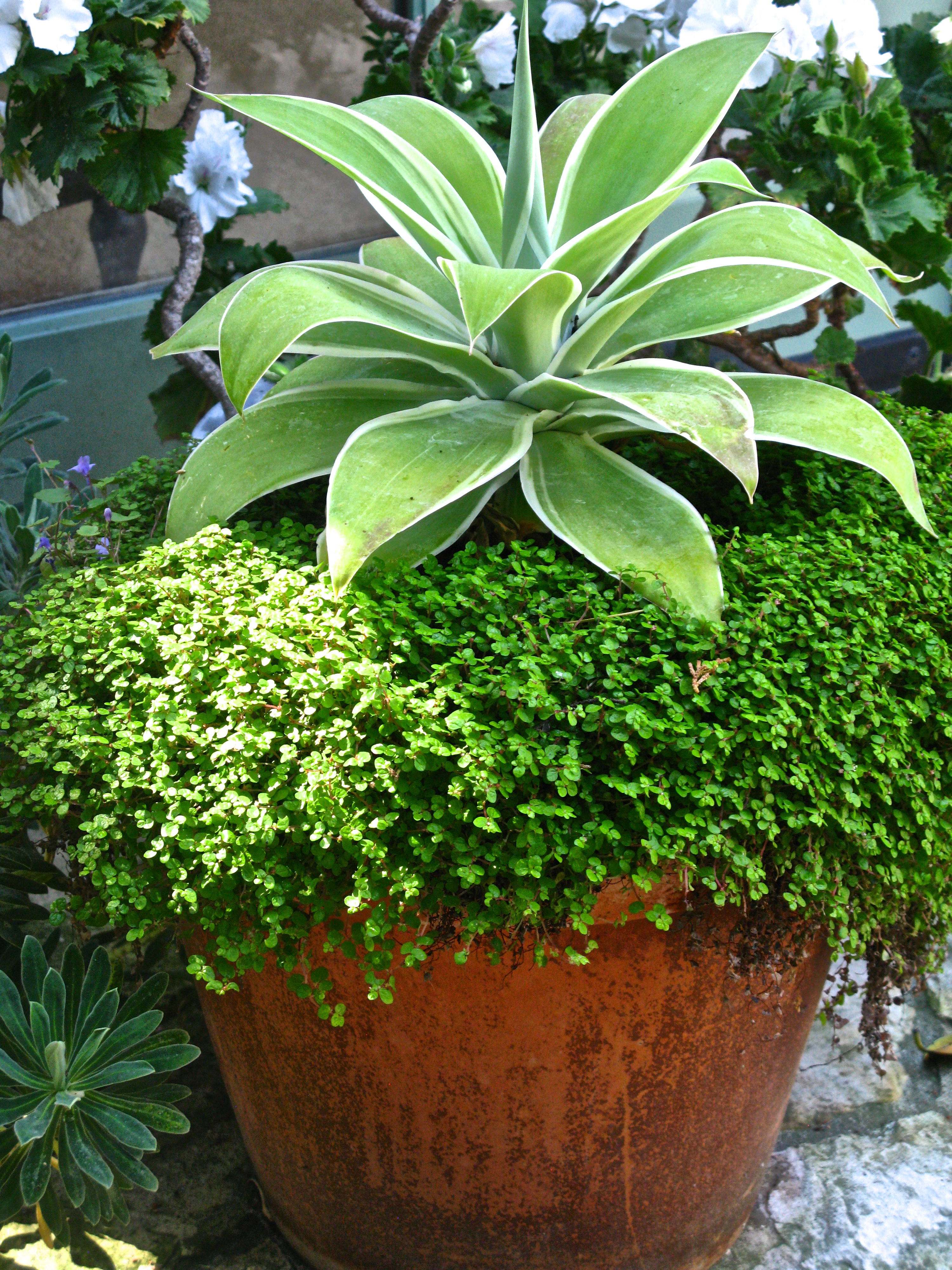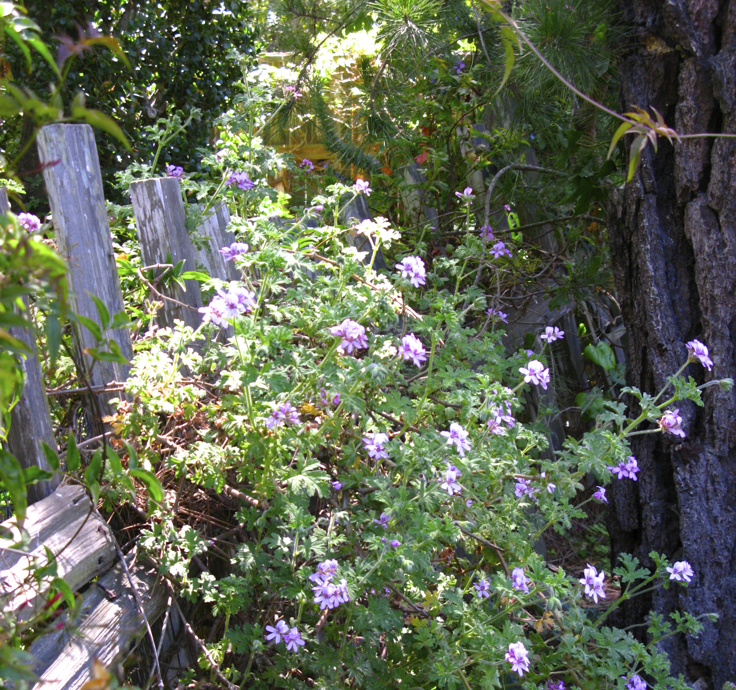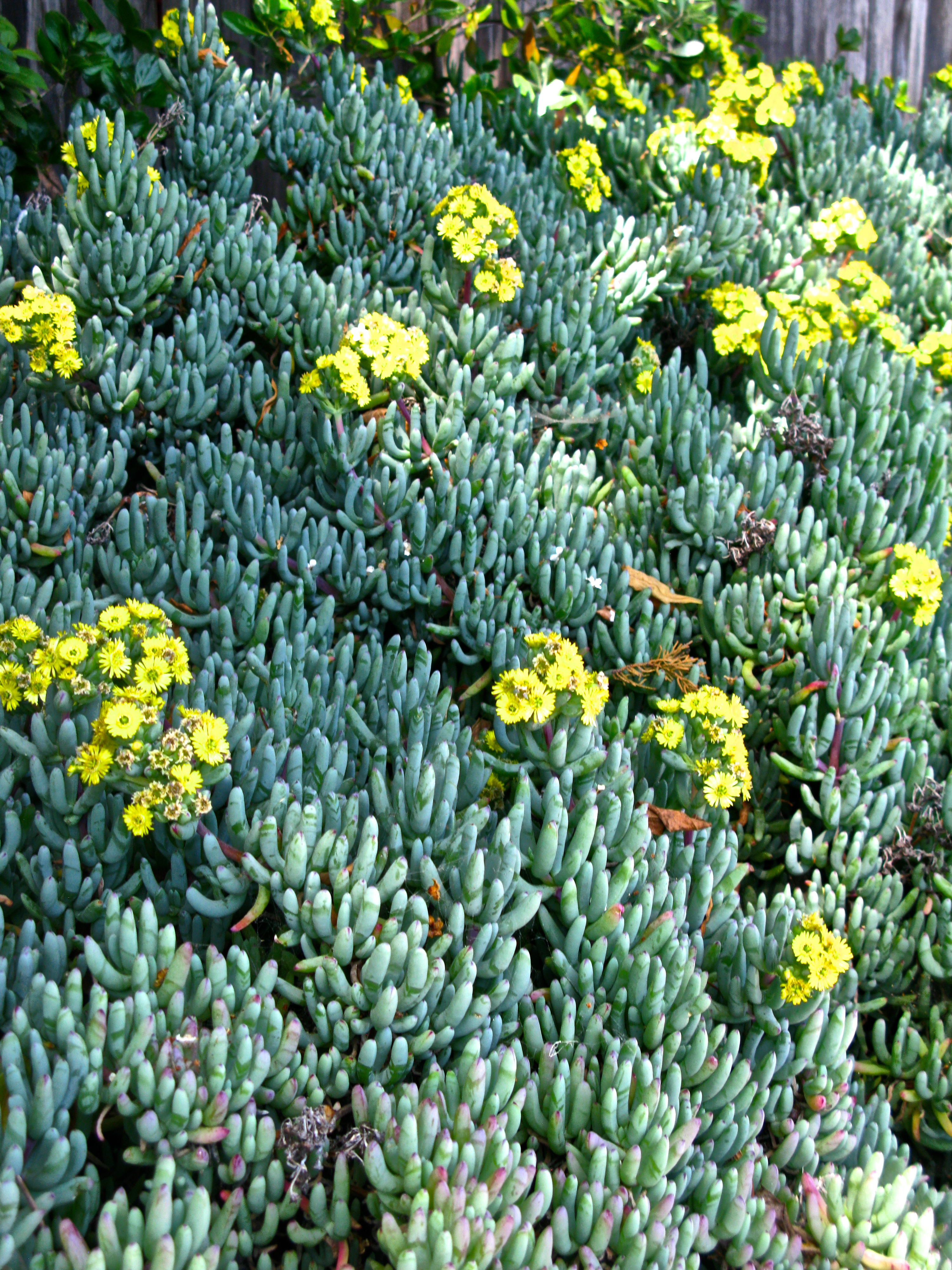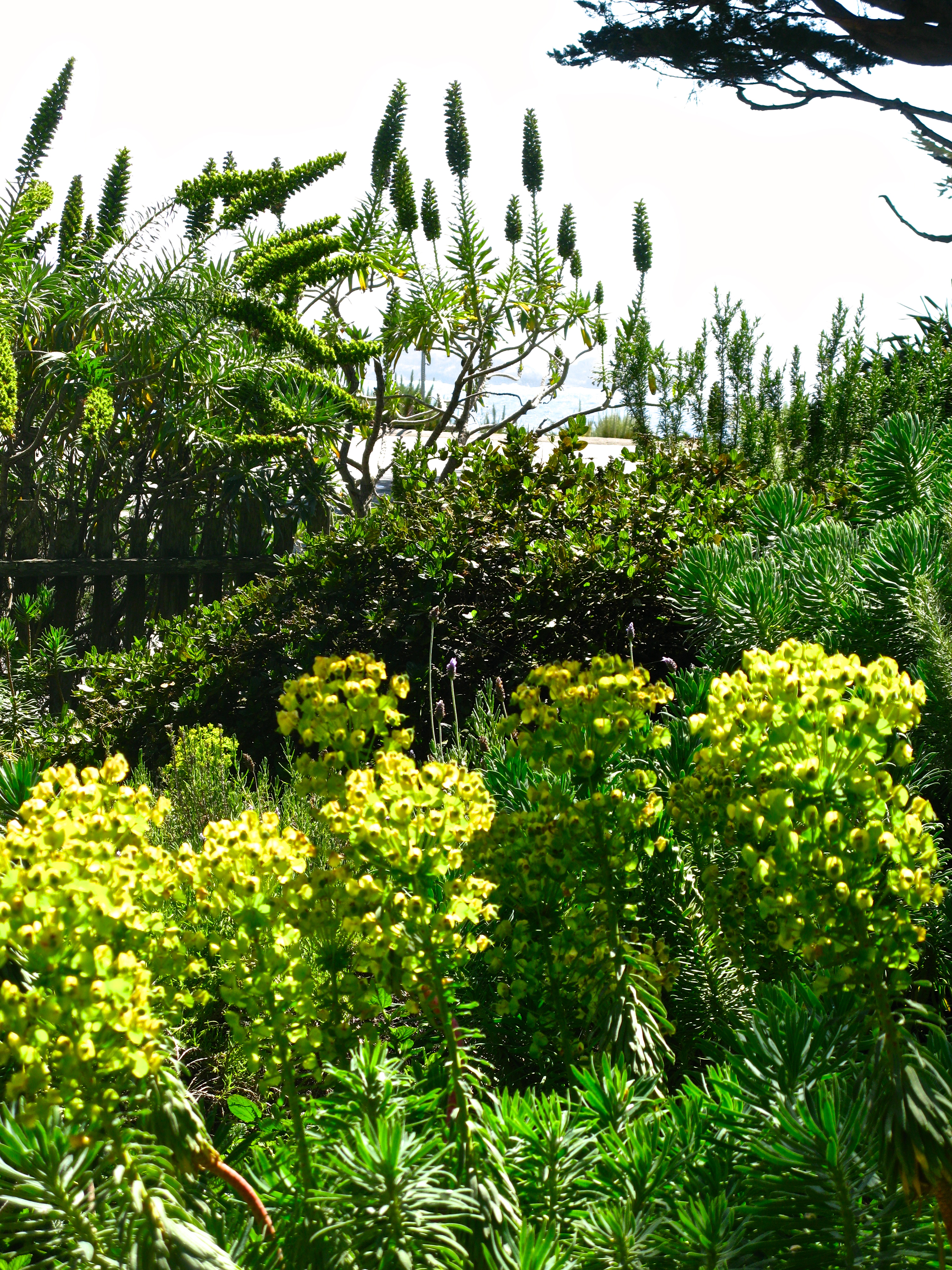 The owner has mentioned the many growing zones of Carmel. Her site is near the sea and she must deal with wind and salt air. Here Yarrow and California Poppy mingle