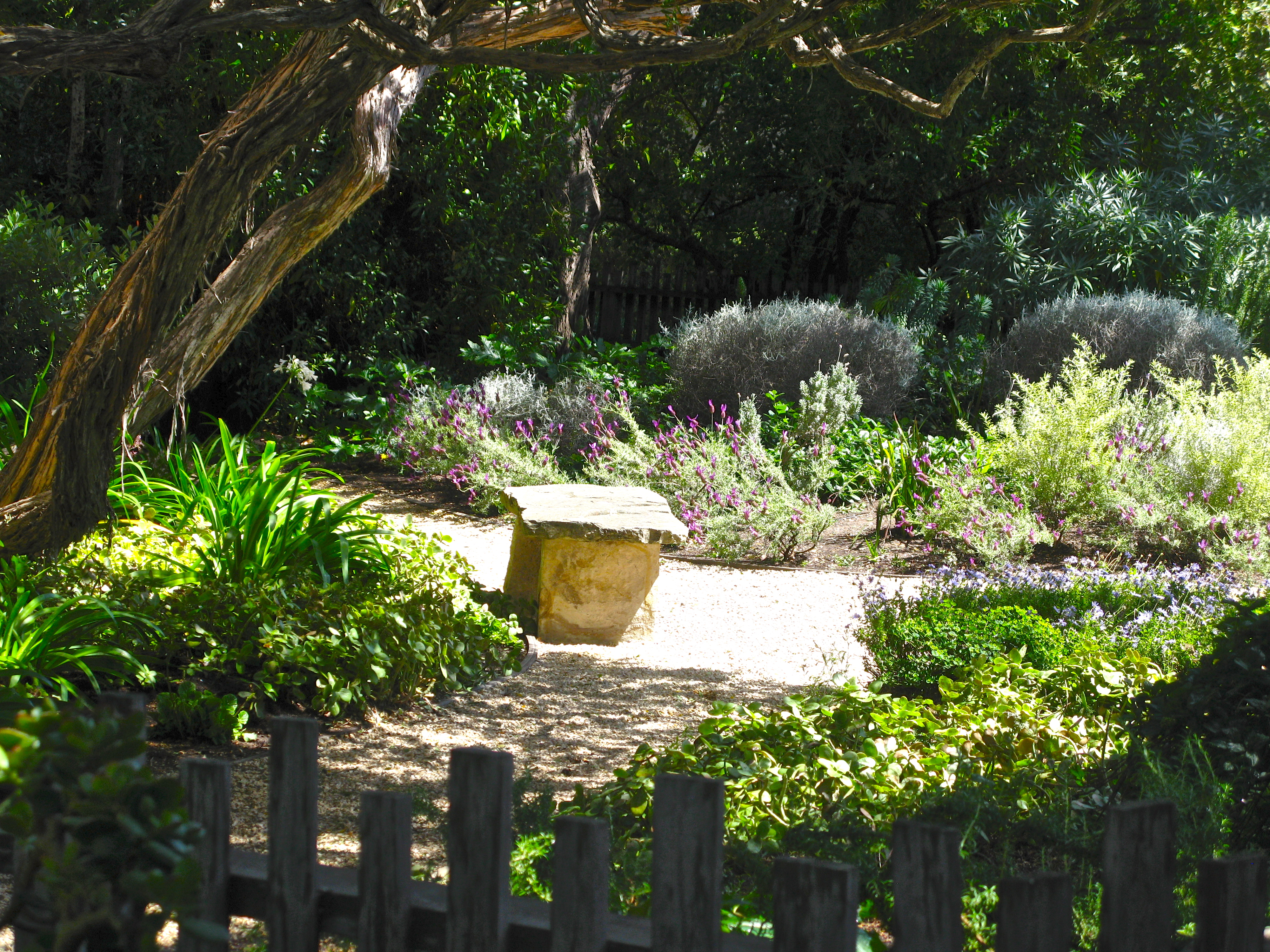 We head out to the yard. It is an informal setting of oaks, pine and low shrubbery. There is birdsong everywhere.